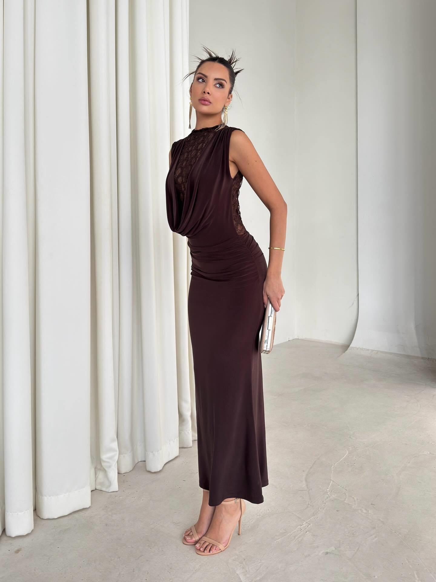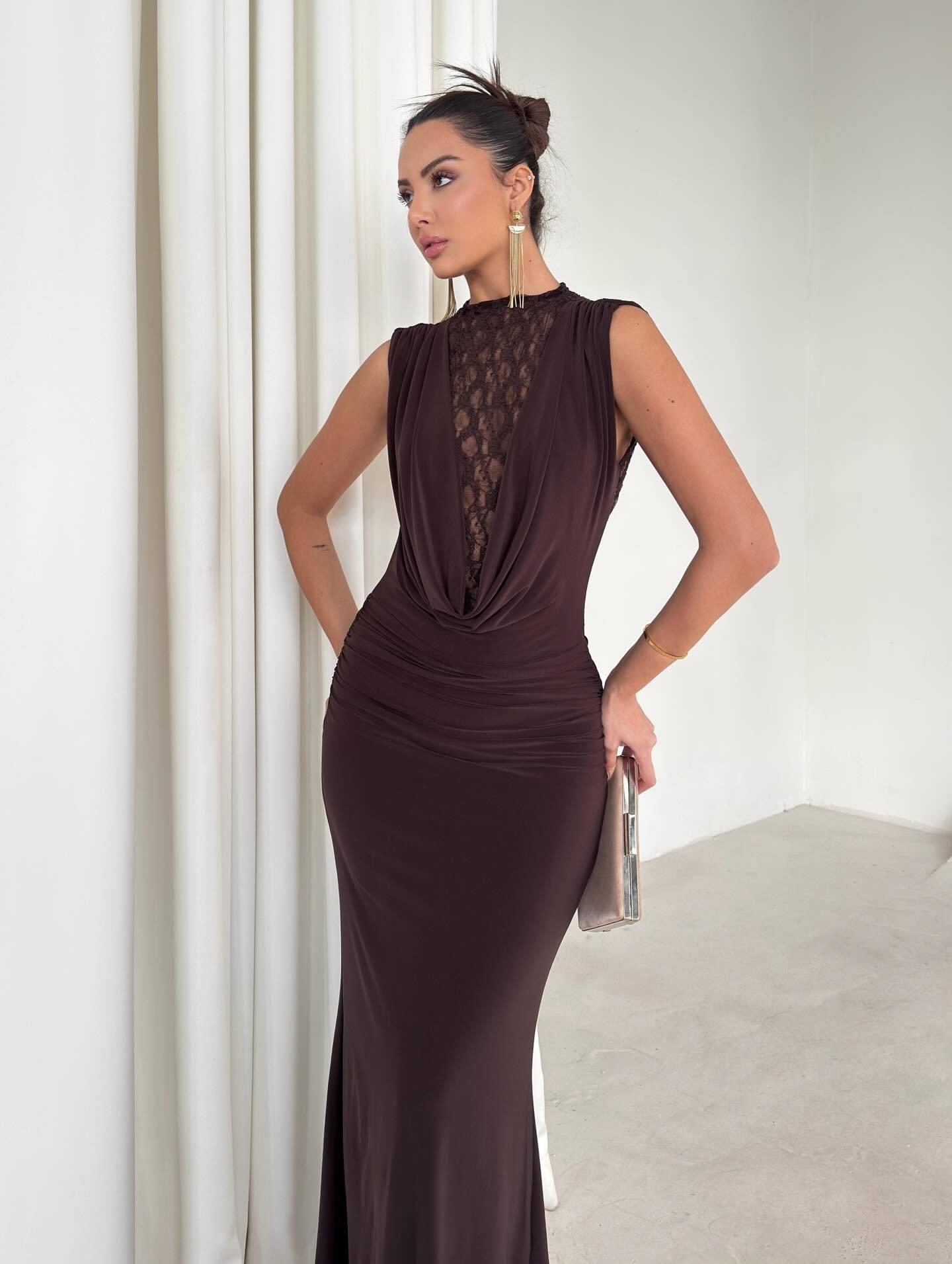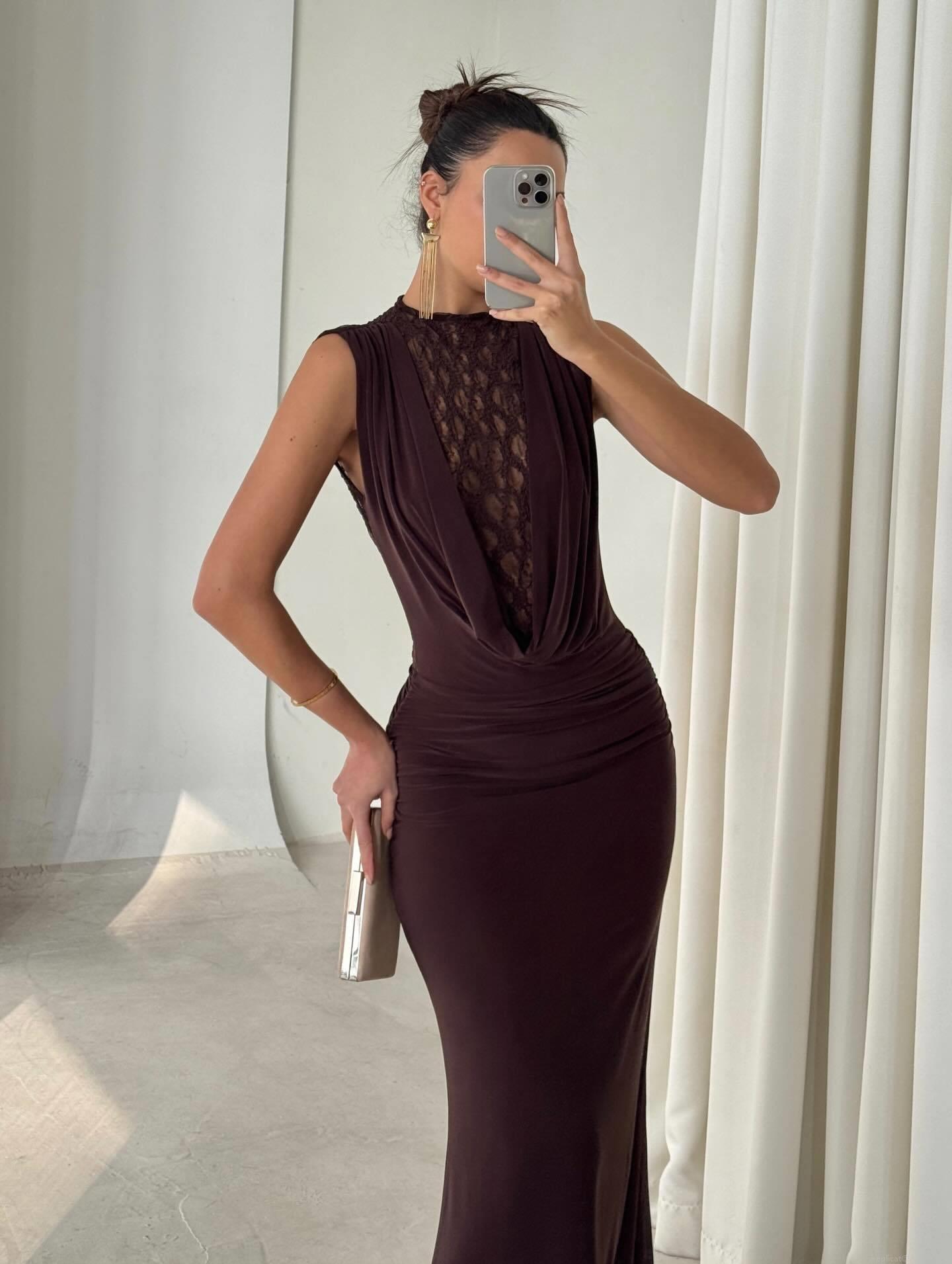 • Women's Sexy Lace Patchwork Sleeveless Maxi Dress Slim Fit Backless Bodycon Evening Gown For Party Banquet Deep Brown Elegant Floor Length Clubwear Dress