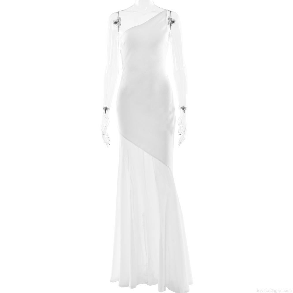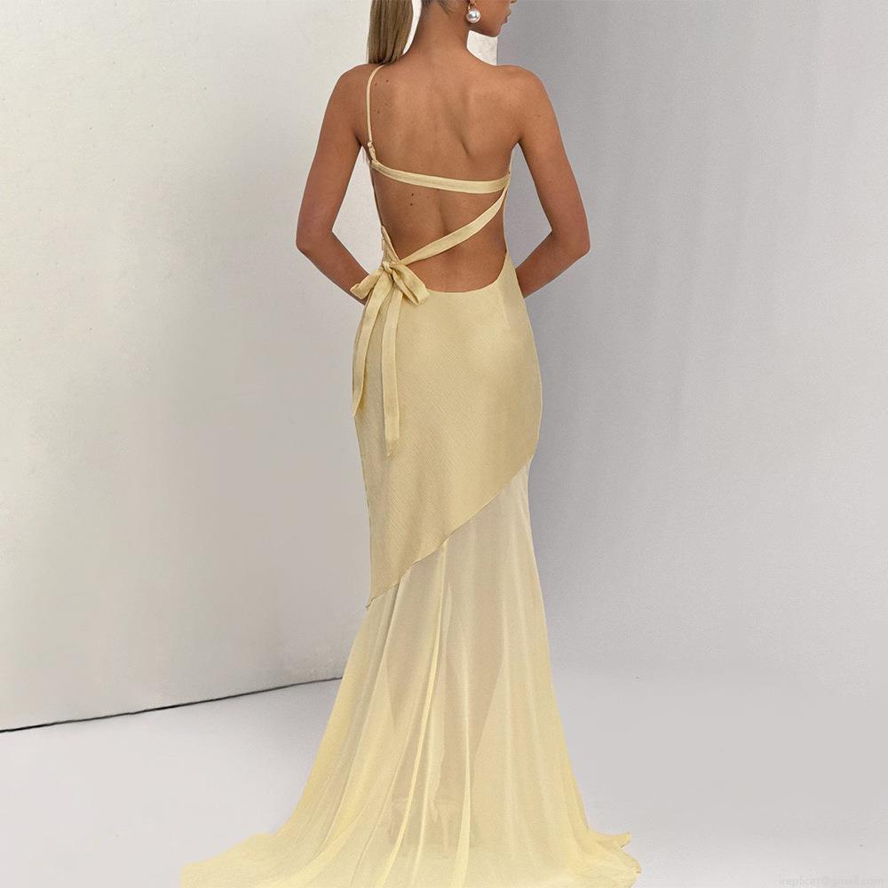 • Women's Sexy One Shoulder Backless Maxi Dress Satin Mesh Splicing Mermaid Evening Gown Cocktail Party High Waist Slim Fit Sleeveless Bodycon Long Dress