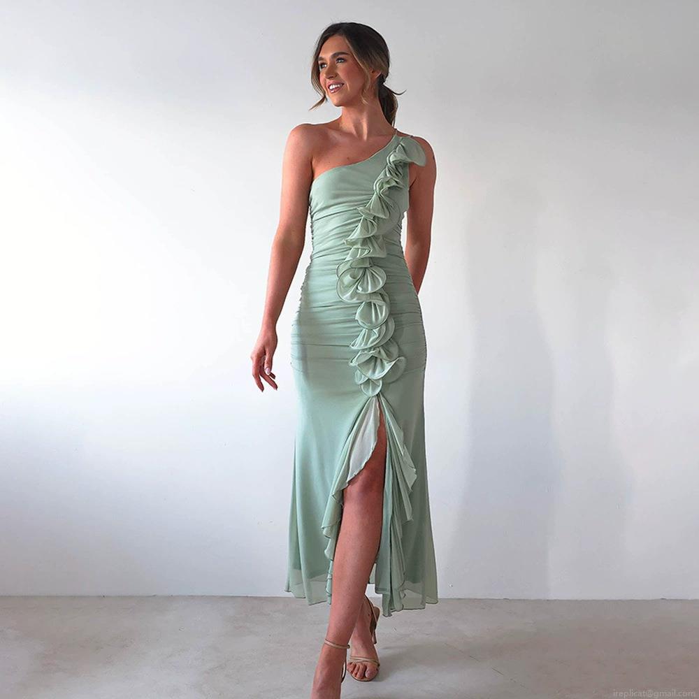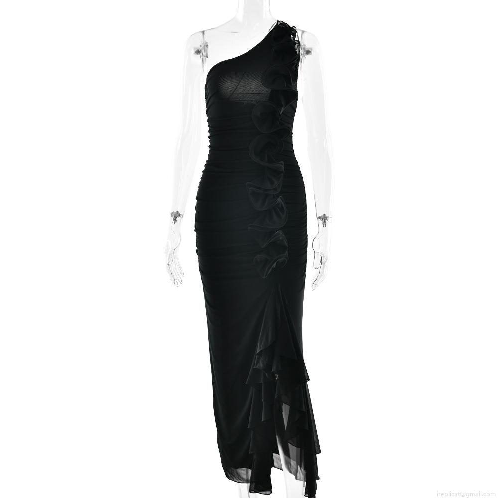 • Women's Sexy One Shoulder Ruffle Maxi Dress Mesh Milk Silk Ruched High Split Backless Bodycon Evening Party Long Dress Summer Fashion