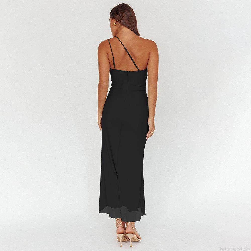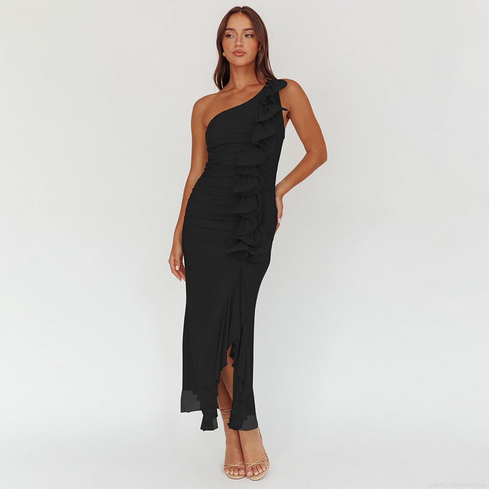 Solid Color, One Shoulder, Pleats, Ruffles, Backless, Forked