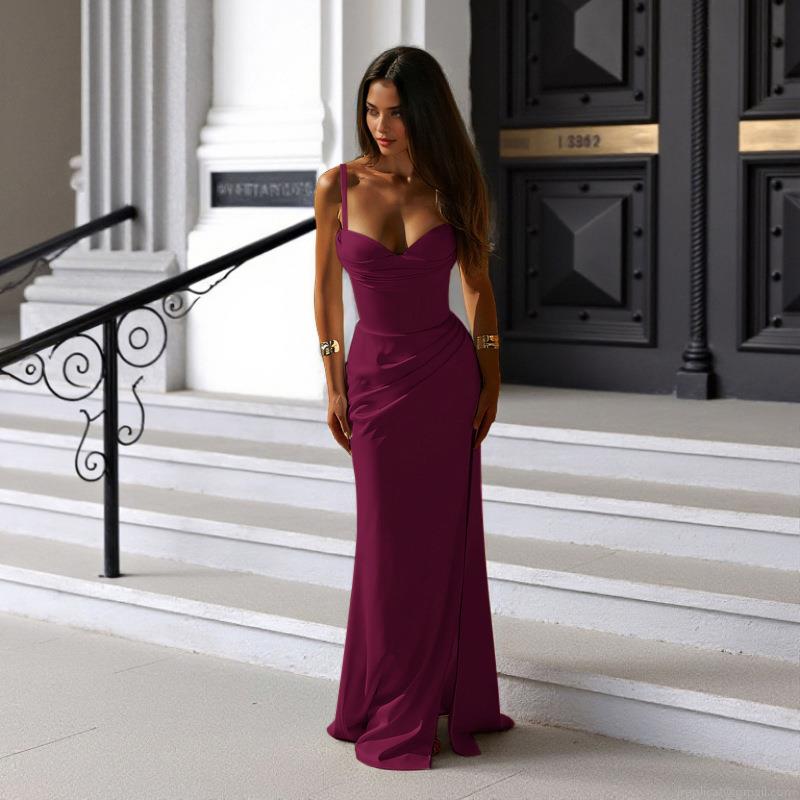 Solid Color, Pleats, Forked, Thin Straps, Heart-shaped Neckline