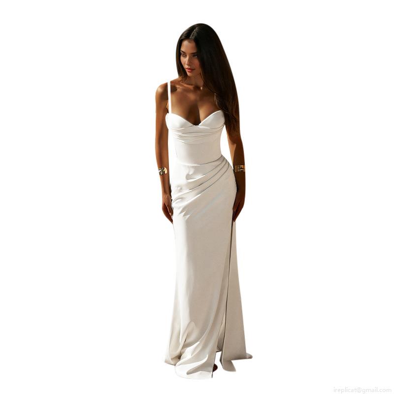• Women's Sexy Spaghetti Strap High Slit Maxi Dress Satin Ruched V-Neck Backless Evening Gown For Wedding Party Banquet Elegant Formal Long Dress