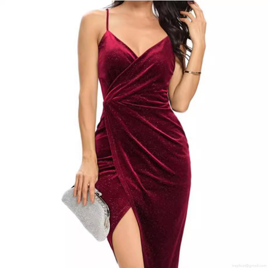 • Women's Sexy Spaghetti Strap V Neck Velvet Dress Ruched High Slit Bodycon Glitter Evening Party Club Midi Dress