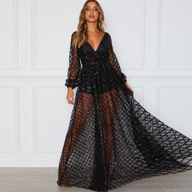 • Women Sexy Deep V Neck Backless Sequin Maxi Dress Elegant Long Sleeve Mesh Formal Evening Gown For Wedding Party Banquet Gold Black