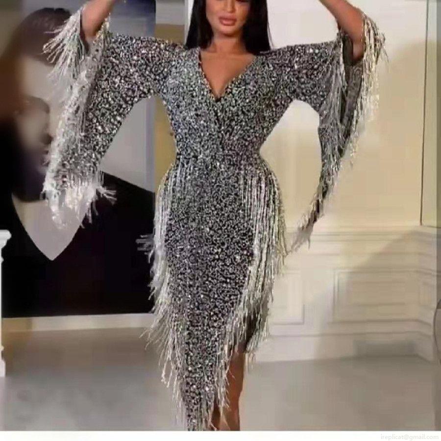 • Women's Deep V Neck Long Sleeve Sequin Tassel Dress Sexy Irregular Hem Glitter Fringe Evening Party Bodycon Midi Dress Special Occasion Gown