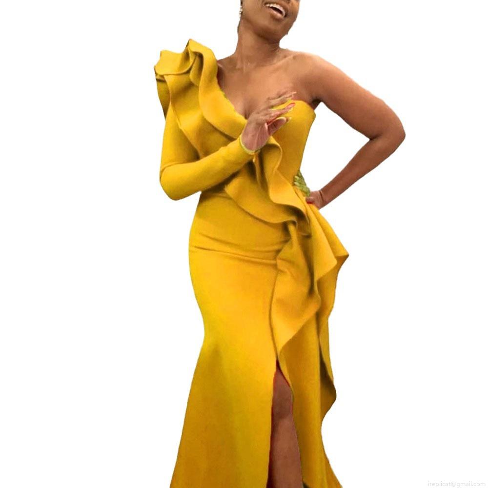 Stunning one-shoulder ruffle evening gown! Beautiful sequin detail, high slit design is sexy and elegant. Slim fit flatters perfectly, floor-length style ideal for weddings & formal events. Great quality and gorgeous look—highly recommend!