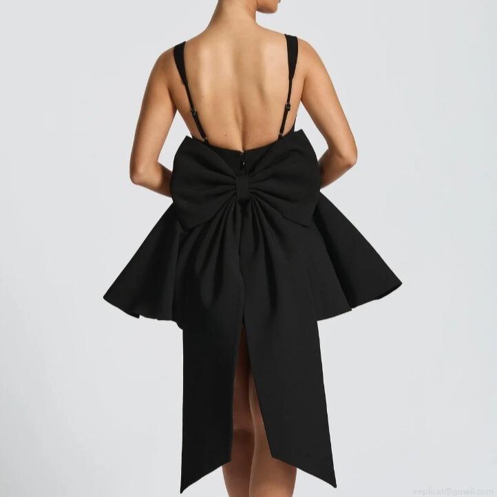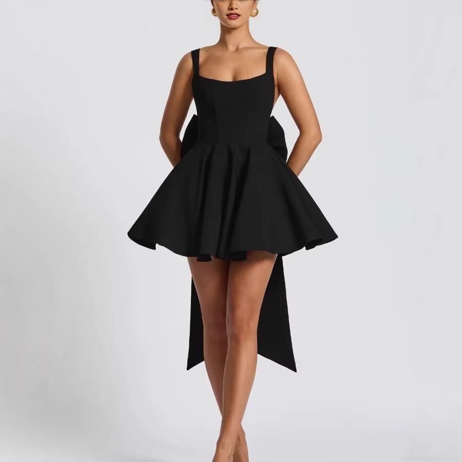 • Women's Elegant Polyester Rayon Backless Big Bow Party Dress Square Neck Sleeveless Puff Mini Dress High-Low Cocktail Gown For Banquet Prom
