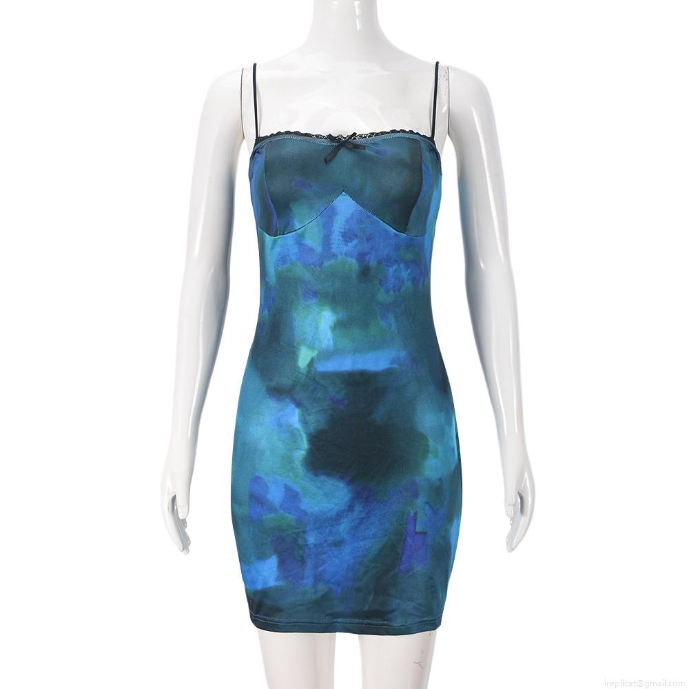 • Sexy Backless Abstract Printed Mini Dress Women Polyester Milk Silk Cami Bodycon Dress With Lace Trim Bow For Summer Party Clubwear