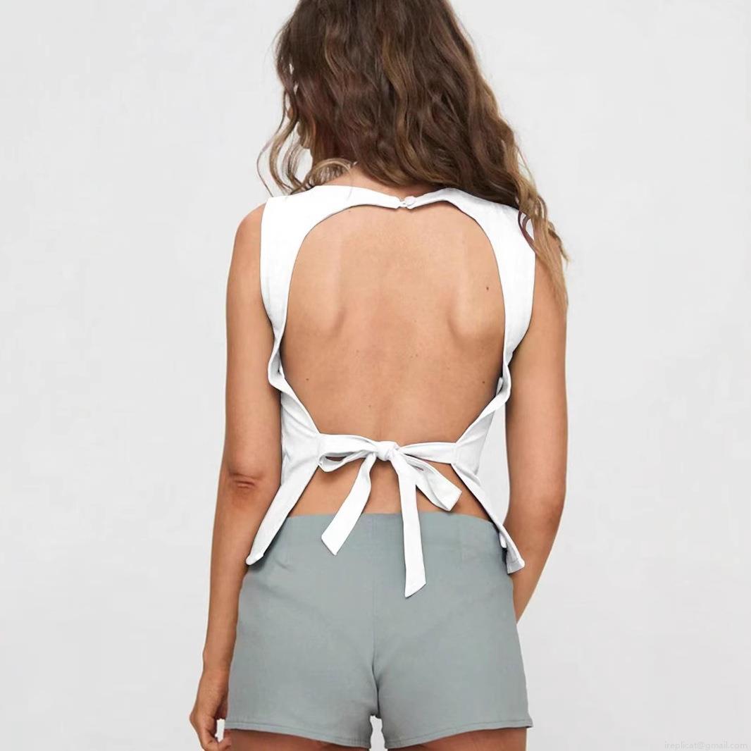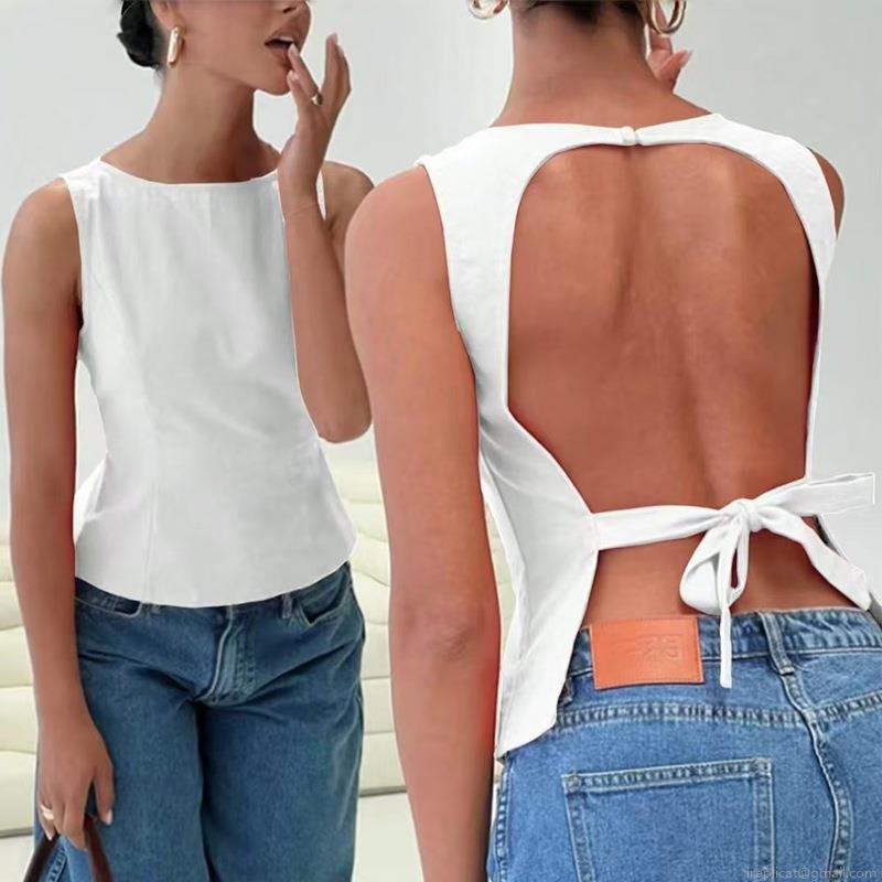 • Sexy Backless Tied Tank Top Women Sleeveless Round Neck Bow Back Slim Fit Cropped Polyester Spandex Vest Streetwear Casual Summer Top