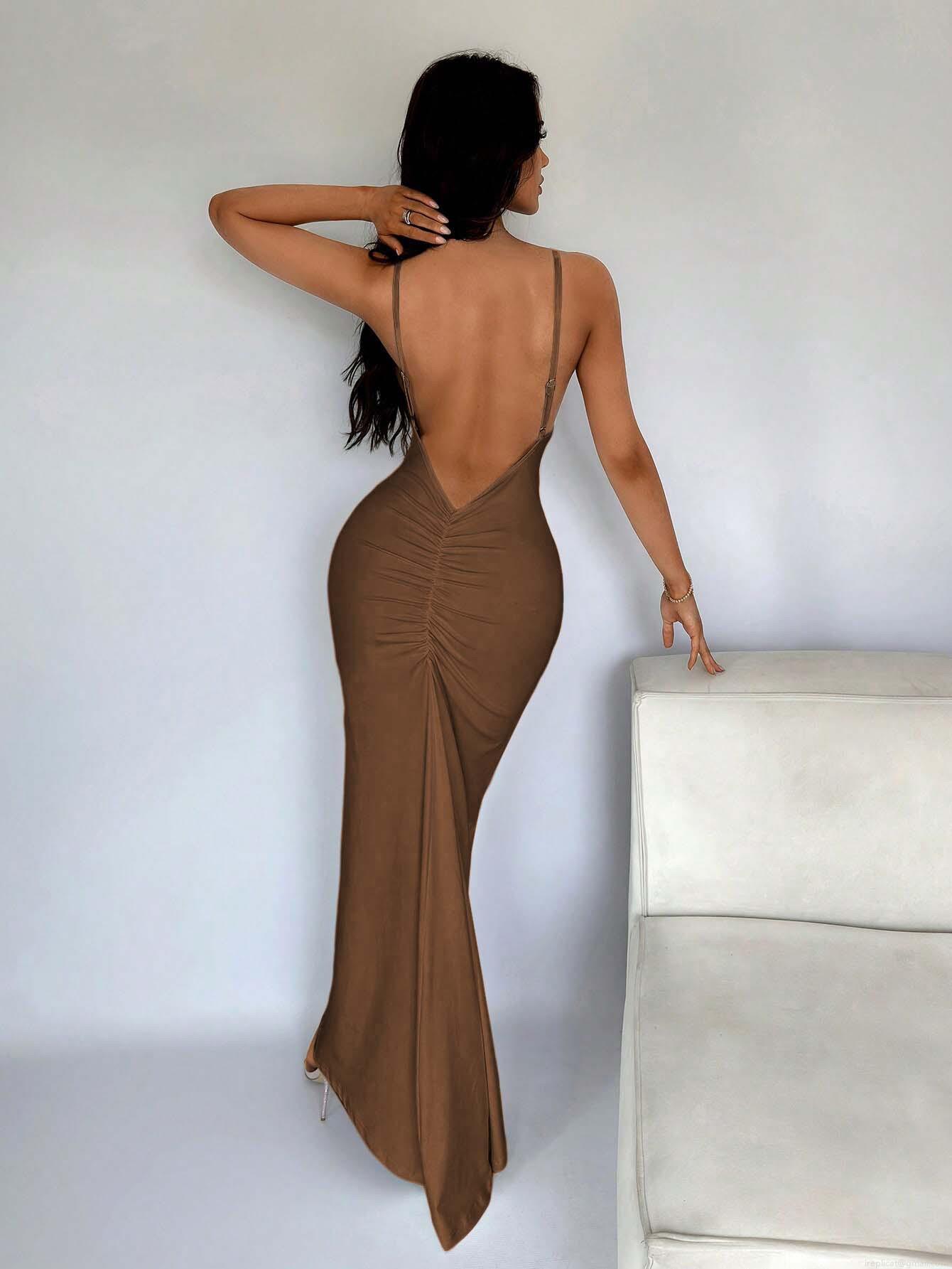 • Sexy Deep V Neck Backless Bodycon Maxi Dress For Women Summer Sleeveless Ruched High Waist Club Party Polyester Elastane Evening Long Gown