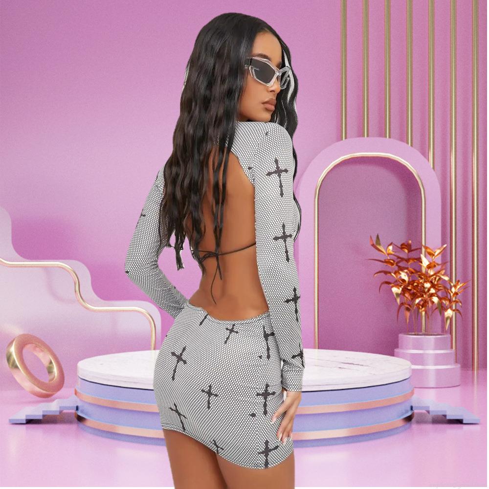 • Sexy Hollow Out Backless Mini Dress Women Long Sleeve Cross Print Bodycon Club Party Bandage Dress Streetwear