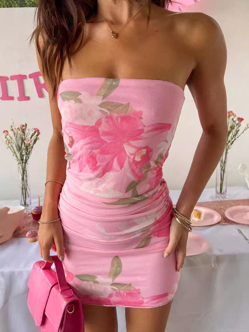 • Sexy Pink Floral Ruched Bodycon Mini Dress Women Summer Party Sleeveless Tube Top Mesh Milk Silk Double Layer Slim Fit Elegant Evening Partywear