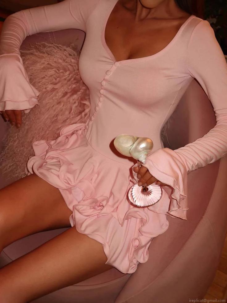 • Sexy V-Neck Ruffle Mini Dress For Women Elegant Long Bell Sleeve A-Line Polyester Dress With Buttons For Party Vacation Casual Short T-Shirt Dress