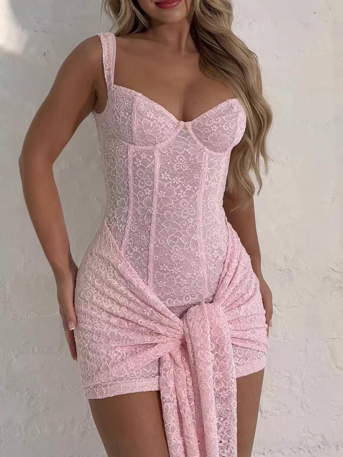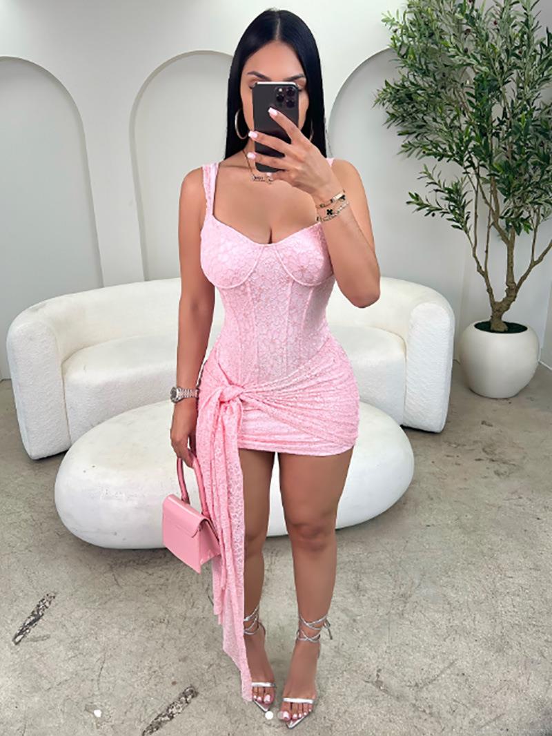• Sexy Women Lace Sling Corset Mini Dress With Waist Tie Knot Elegant Bodycon Sleeveless Club Party Ruched Short Dress Polyester Lace Patchwork Clothing