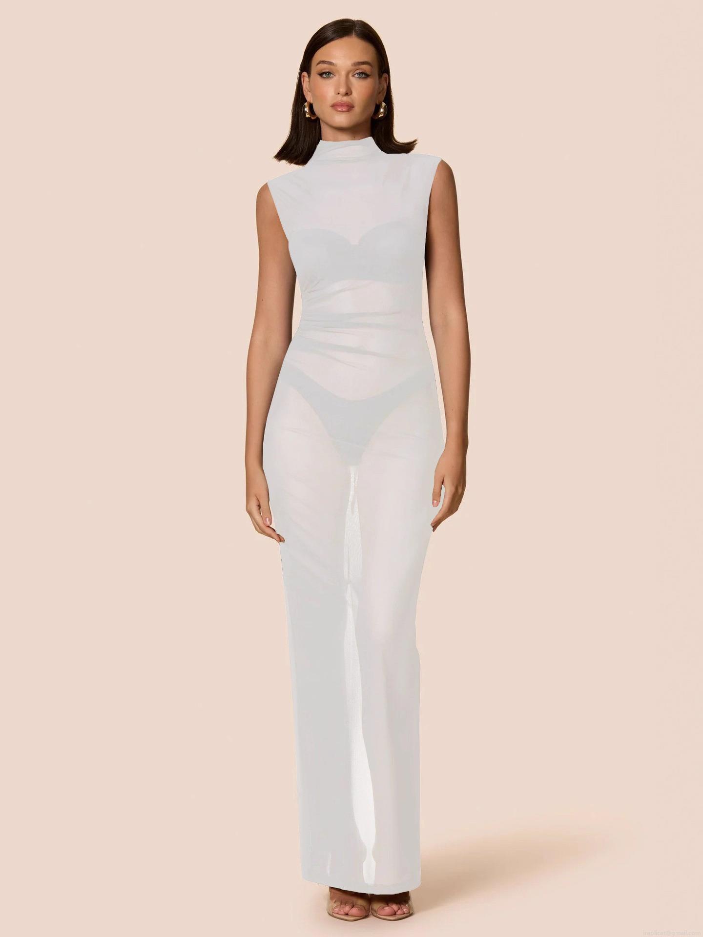 Sexy Women See-through Mesh Sleeveless Stand Collar Maxi Dress Ruched Bodycon Slim Fit Back Slit Long Gown for Party Clubwear Night Out