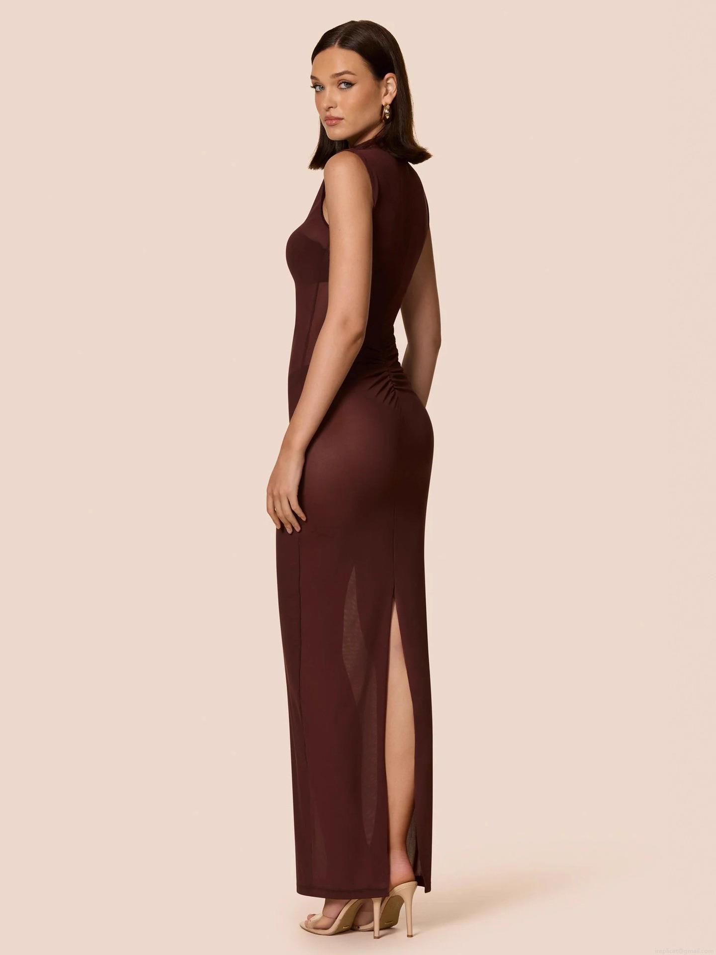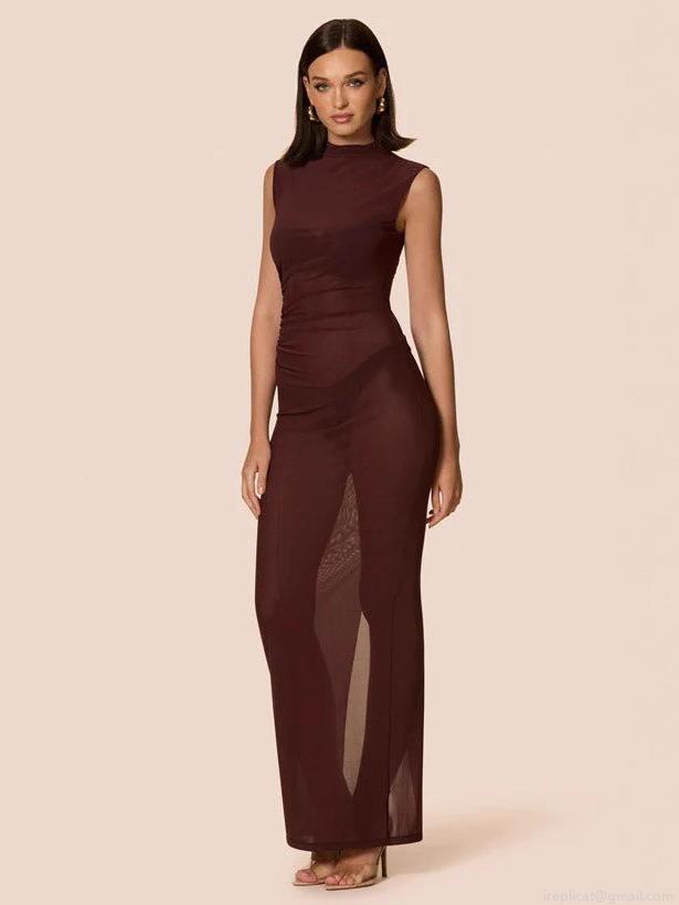 • Sexy Women See-through Mesh Sleeveless Stand Collar Maxi Dress Ruched Bodycon Slim Fit Back Slit Long Gown for Party Clubwear Night Out