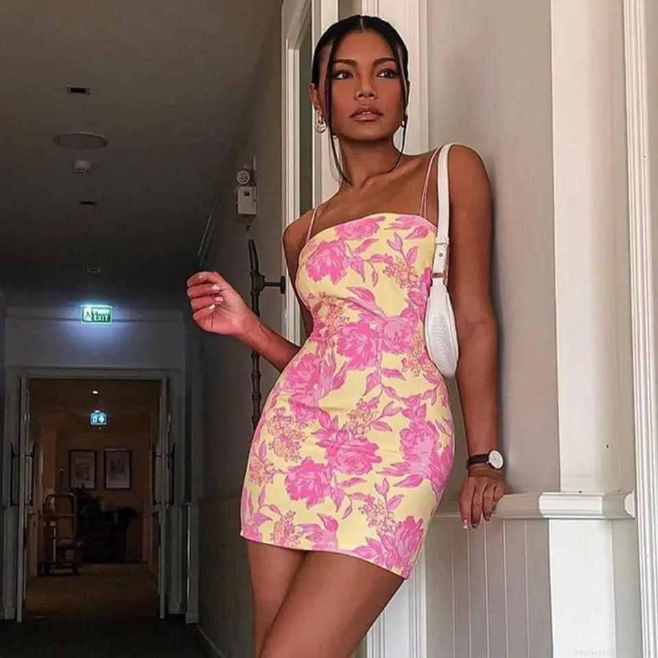 • Sexy Women's Rose Floral Print Mini Dress Spaghetti Strap Bodycon Off-Shoulder Sleeveless Yellow Pink Summer Vacation Party Clubwear Outfits