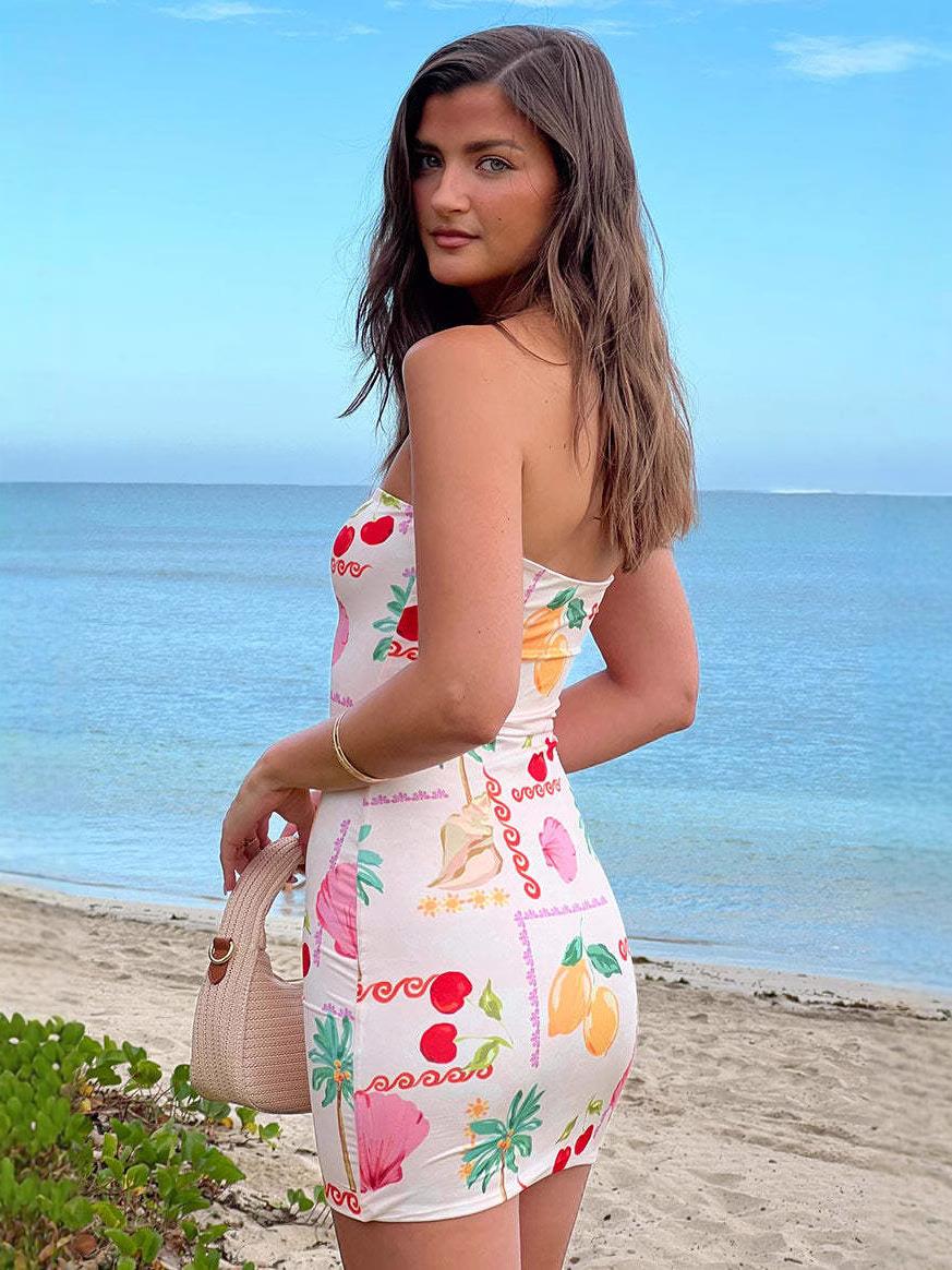 Sexy Women's Tube Dress 83% Polyester 17% Elastane Bodycon Mini Dress Floral Tropical Lemon Fruit Print Summer Vacation Beach Clubwear Party Strapless Dress