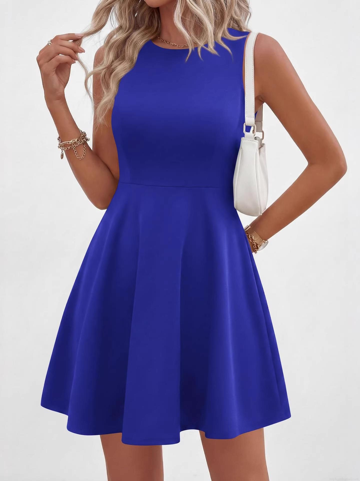 • Summer Women Sleeveless Round Neck A-Line Mini Dress Polyester Spandex Blend Casual Slim Fit Solid Color Commuter Swing Short Dress
