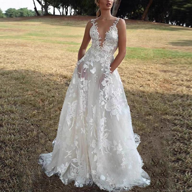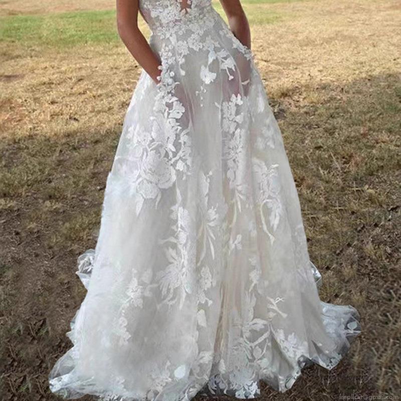 5 stars – This lace wedding dress is **absolutely stunning and romantic**! The delicate lace, soft tulle fabric, and beautiful 3D floral appliques create a dreamy, elegant look full of feminine charm. The sexy deep V-neck design flatters the neckline perfectly, while the classic A-line silhouette fits all body types beautifully and flows gracefully. The white sequin details add just the right amount of sparkle without being overdone. Premium stitching, excellent tailoring, comfortable to wear all day, and true to size. Ideal for weddings, bridal parties, and formal events. Elegant, gorgeous, and highly recommended!