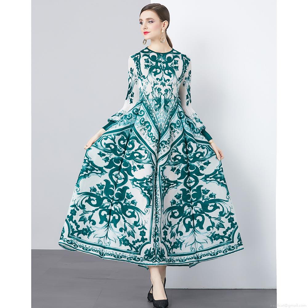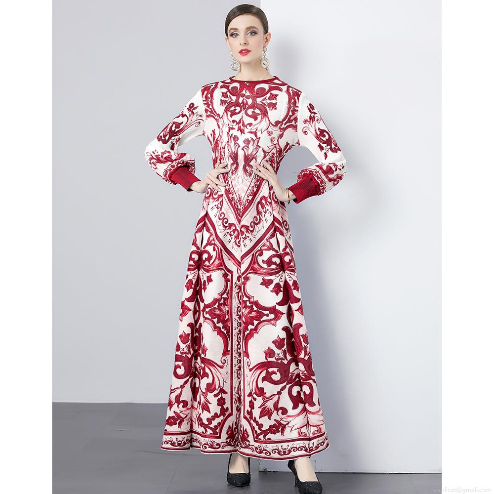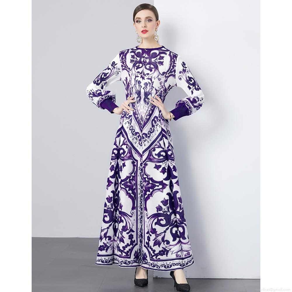 • Women Baroque Print Pleated Maxi Dress Elegant Majolica Style Long Sleeve Lantern Sleeve A-Line Swing Long Dress Retro Party Casual Evening Dress