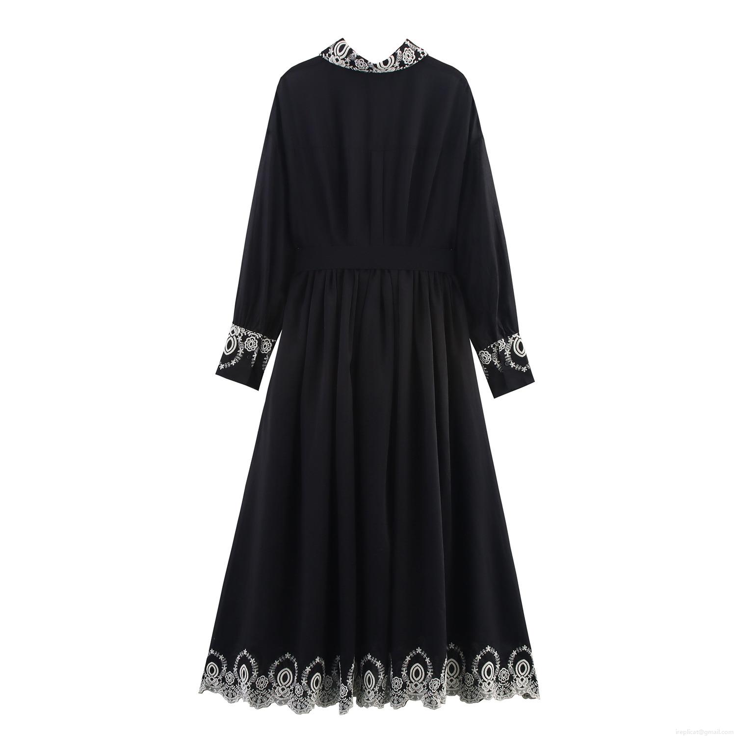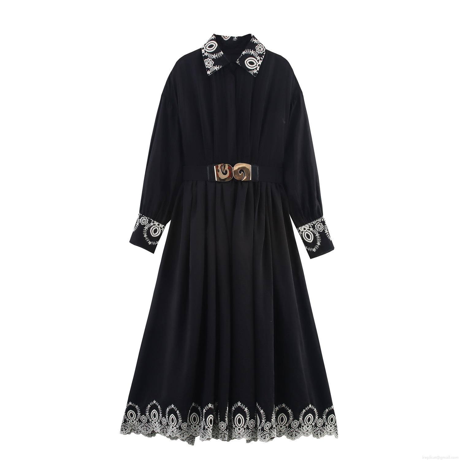 • Women Elegant Black Embroidery Maxi Dress With Belt Turn-down Collar Long Sleeve Polyester Dress Office Commute Ladies Fashion Chic Dress