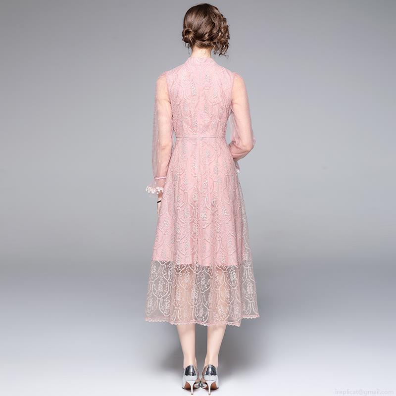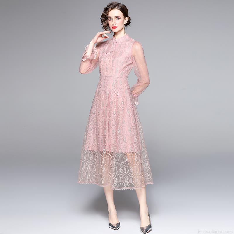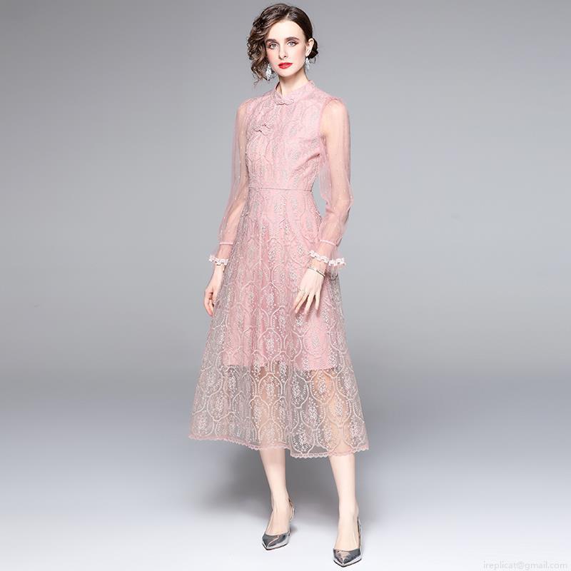 • Women Elegant Pink Lace Embroidery Midi Dress Retro Standing Collar Modified Cheongsam Style Long Sleeve Mesh Patchwork Slim Fit Party Wedding Dresses