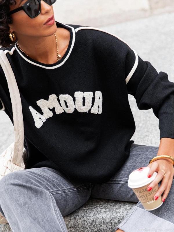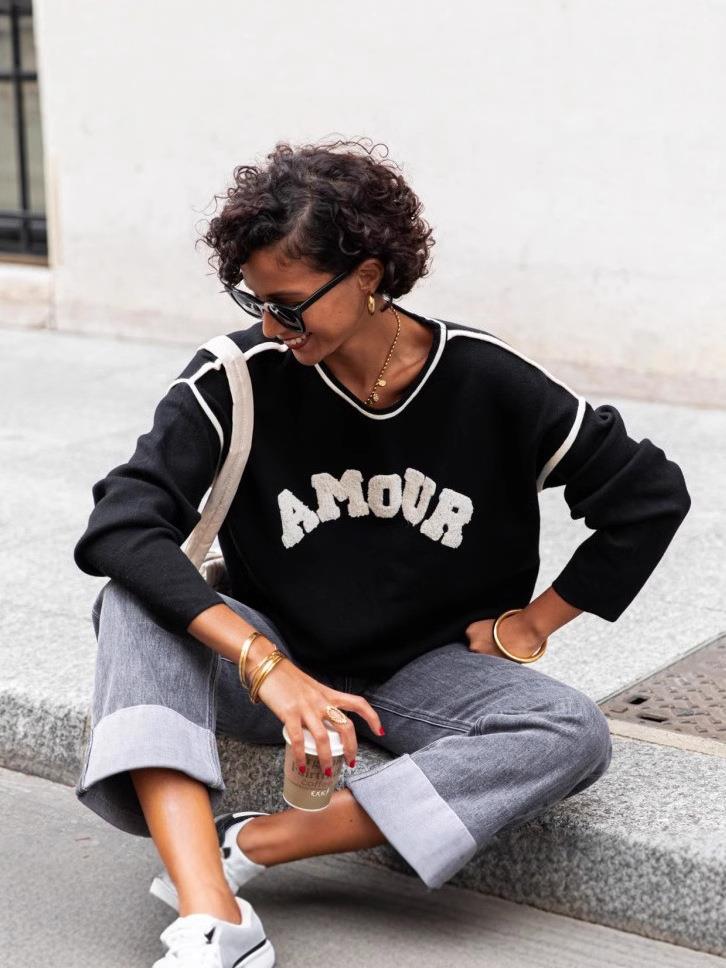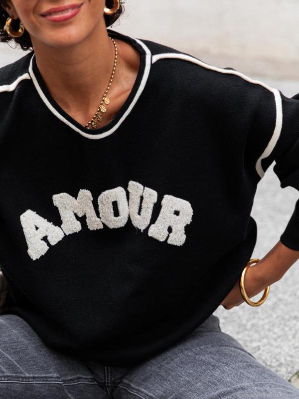 • Women Fashion AMOUR Letter Flocking Knit Sweater Round Neck Contrast Trim Loose Long Sleeve Pullover Casual Streetwear Top