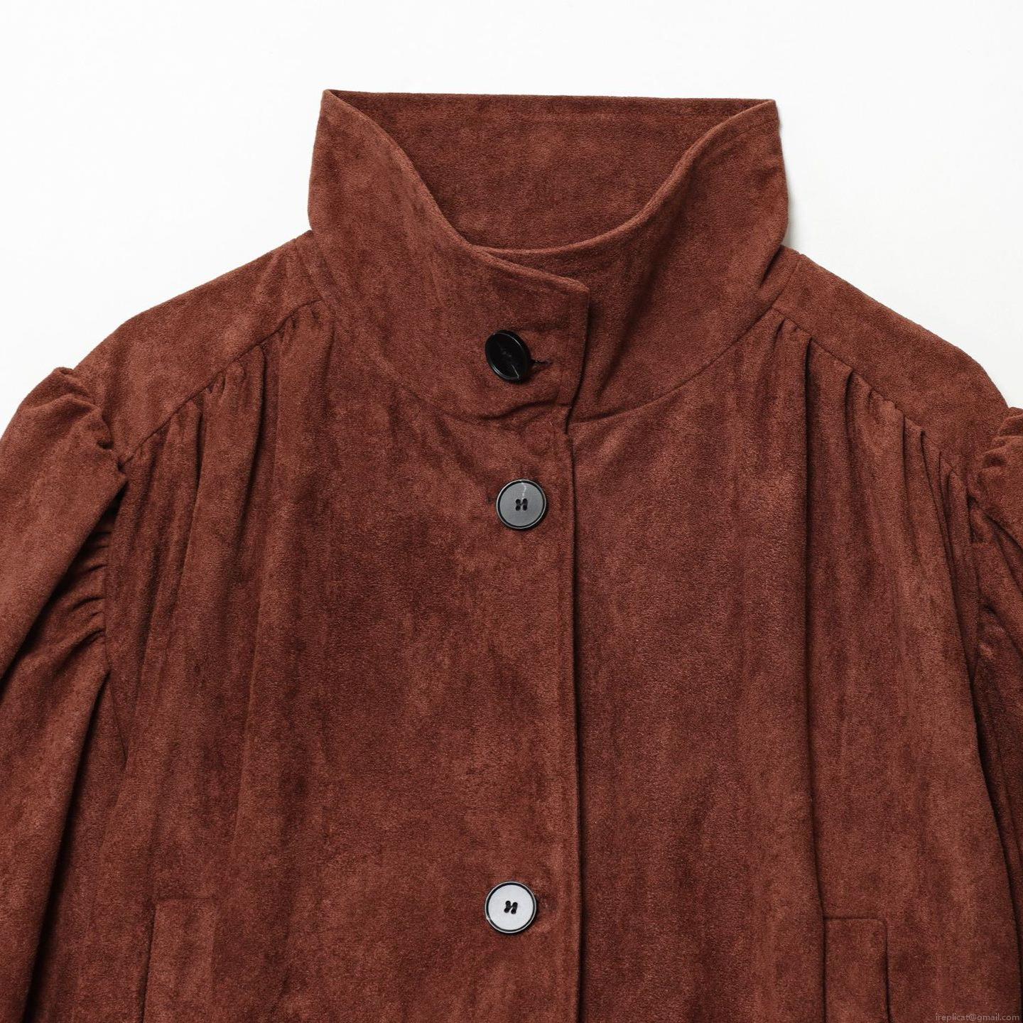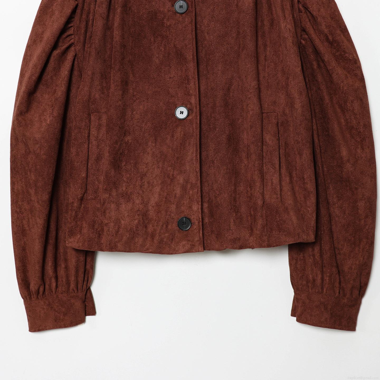 • Women Fashion Faux Suede Jacket Vintage Pleated Puff Sleeve Stand Collar Button Up Short Coat Streetwear Solid Color Outwear For Ladies