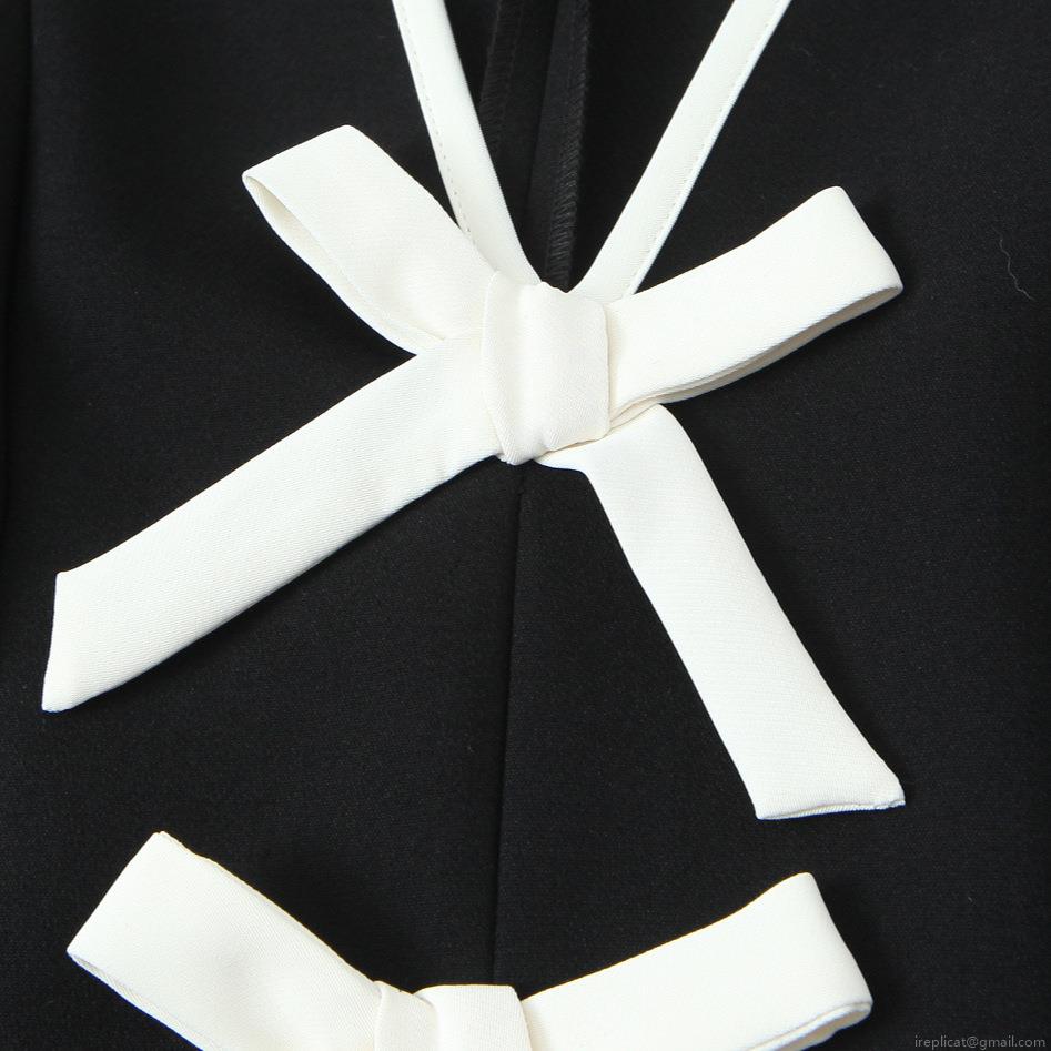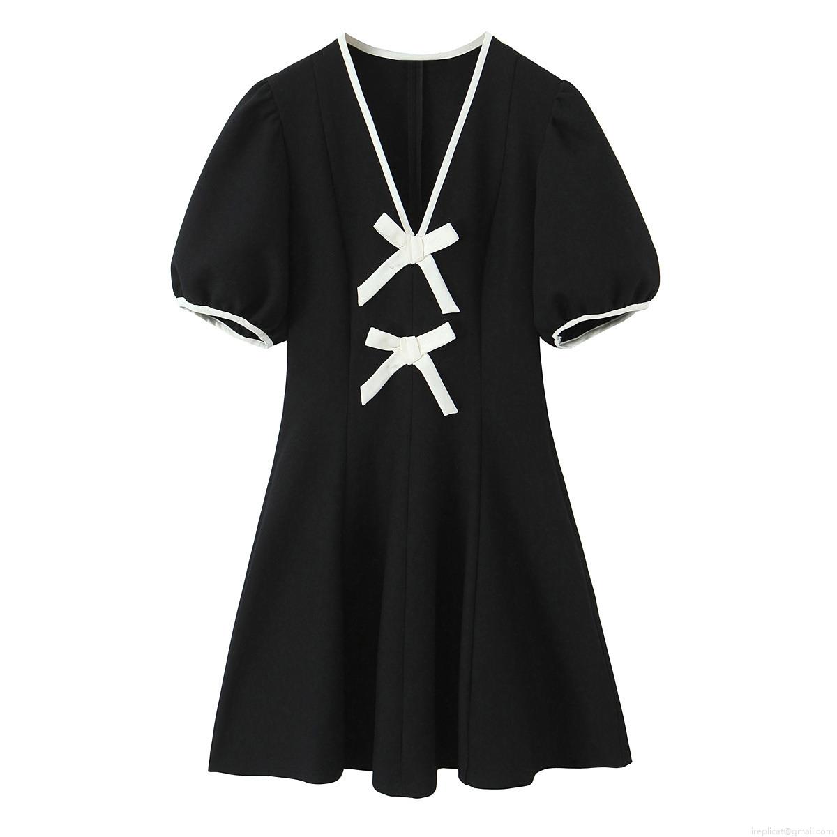 • Women French Vintage Black Mini Dress White Bow Tie Color Contrast V Neck Puff Sleeve Slim Fit A-Line Short Sleeve Party Dress For Dating
