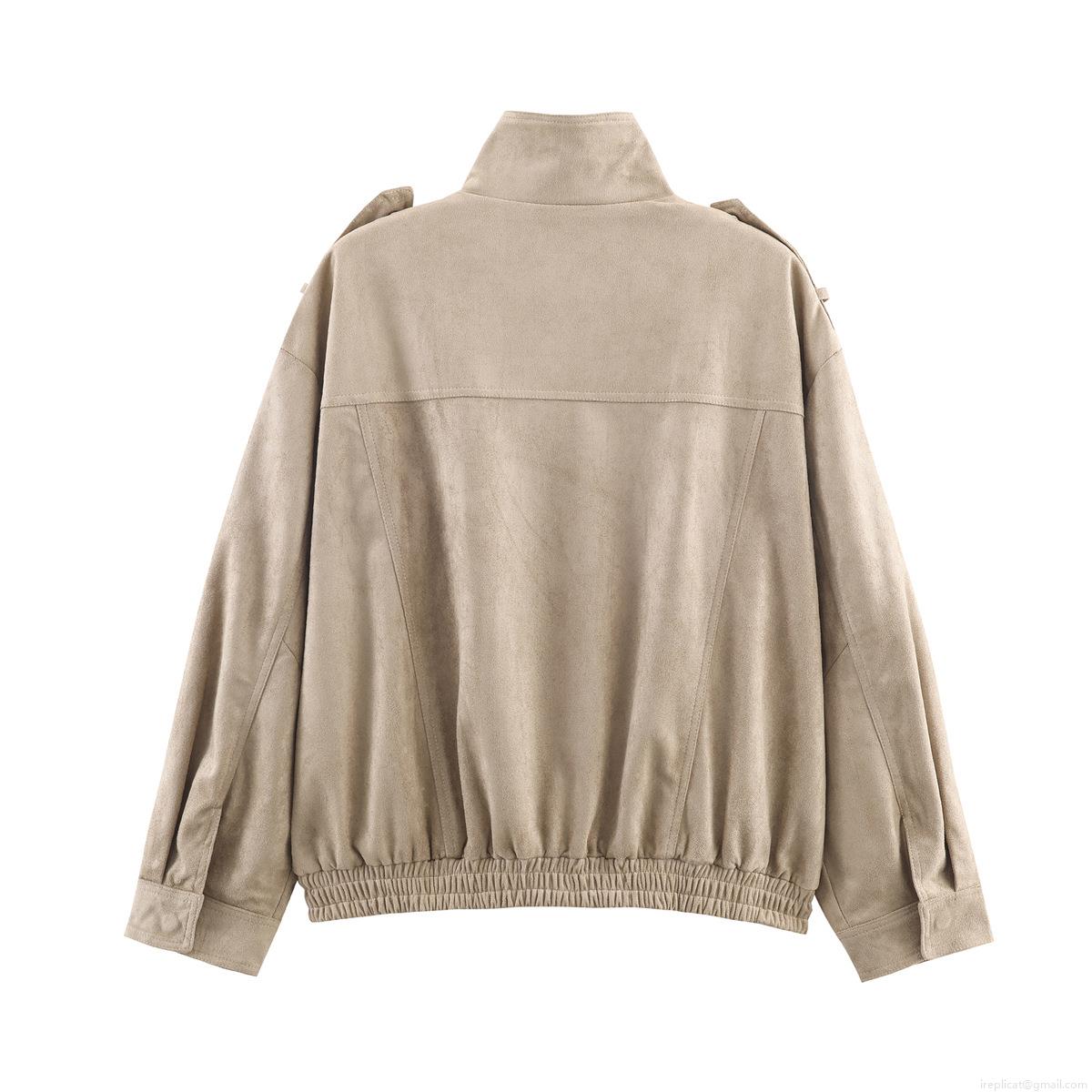 Women French Vintage Faux Suede Jacket Stand Collar Epaulettes Large Flap Pockets Zipper Workwear Coat Solid Color Khaki Casual Outwear