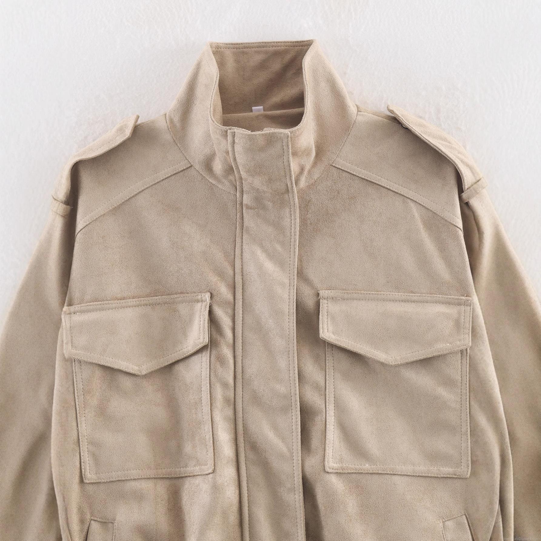 • Women French Vintage Faux Suede Jacket Stand Collar Epaulettes Large Flap Pockets Zipper Workwear Coat Solid Color Khaki Casual Outwear