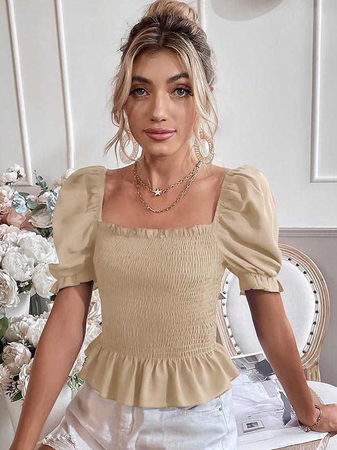 • Women French Vintage Square Neck Smocked Top Summer Short Puff Sleeve Peplum Hem Slim Fit Polyester T-Shirt Casual Elegant Solid Color Blouse
