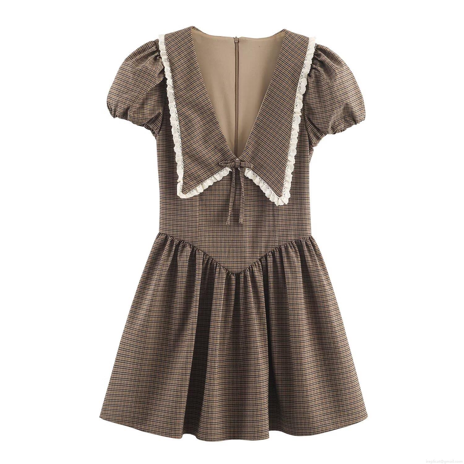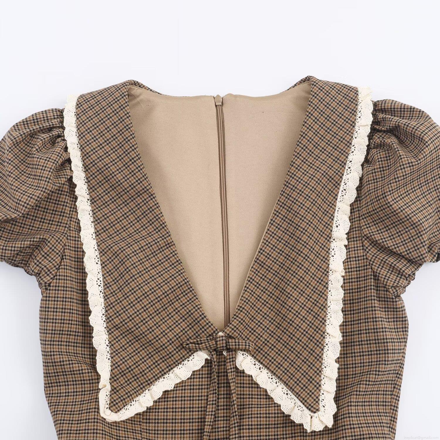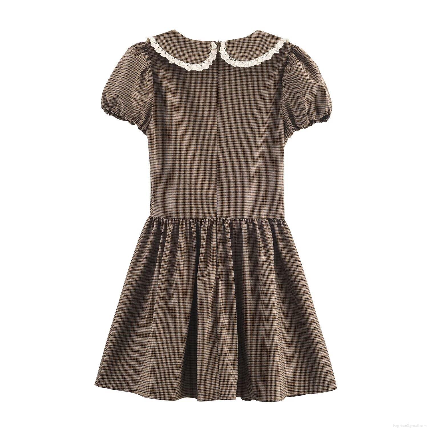 • Women Gingham Mini Dress With White Lace Peter Pan Collar And Puff Sleeves Retro Polyester Plaid Short Sleeve A-Line Dress For Summer Vacation Party Ladies Elegant Cottagecore Dress