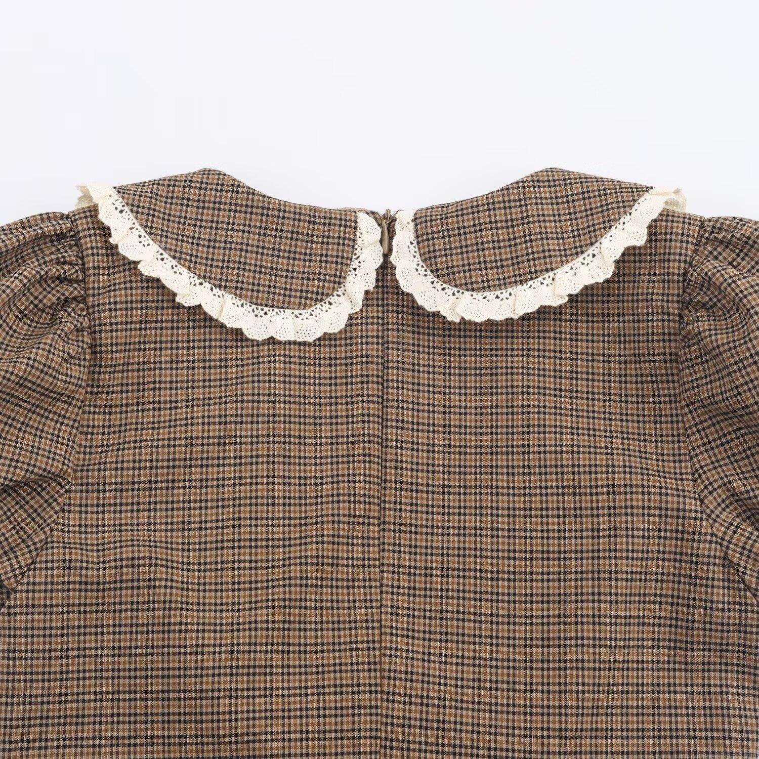 Bow, Checkered Pattern, Pleats, Lace Trim, Puff Sleeves