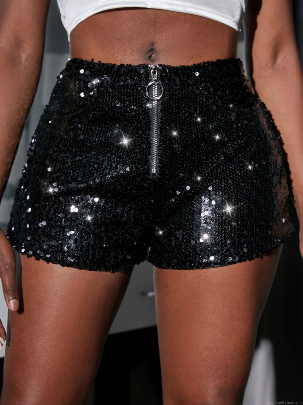 • Women High Waist Sequin Shorts Sexy Slim Fit Metallic Hot Pants with Round Ring Zipper for Party Clubwear Performance Disco Stage Dance Shorts