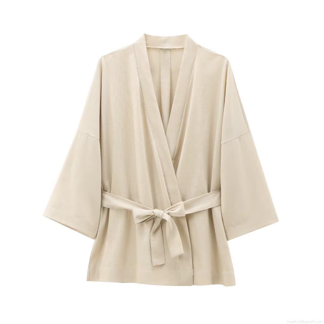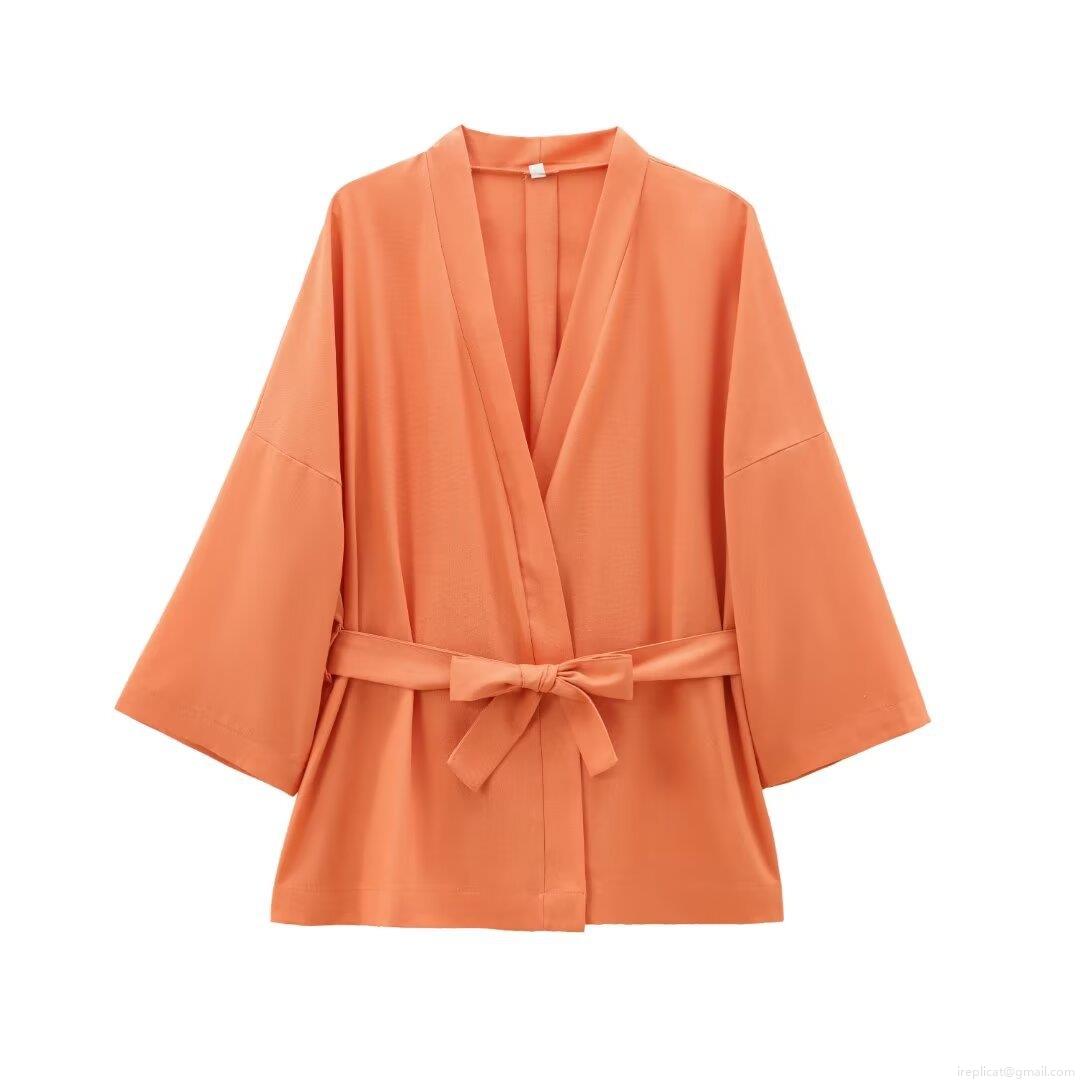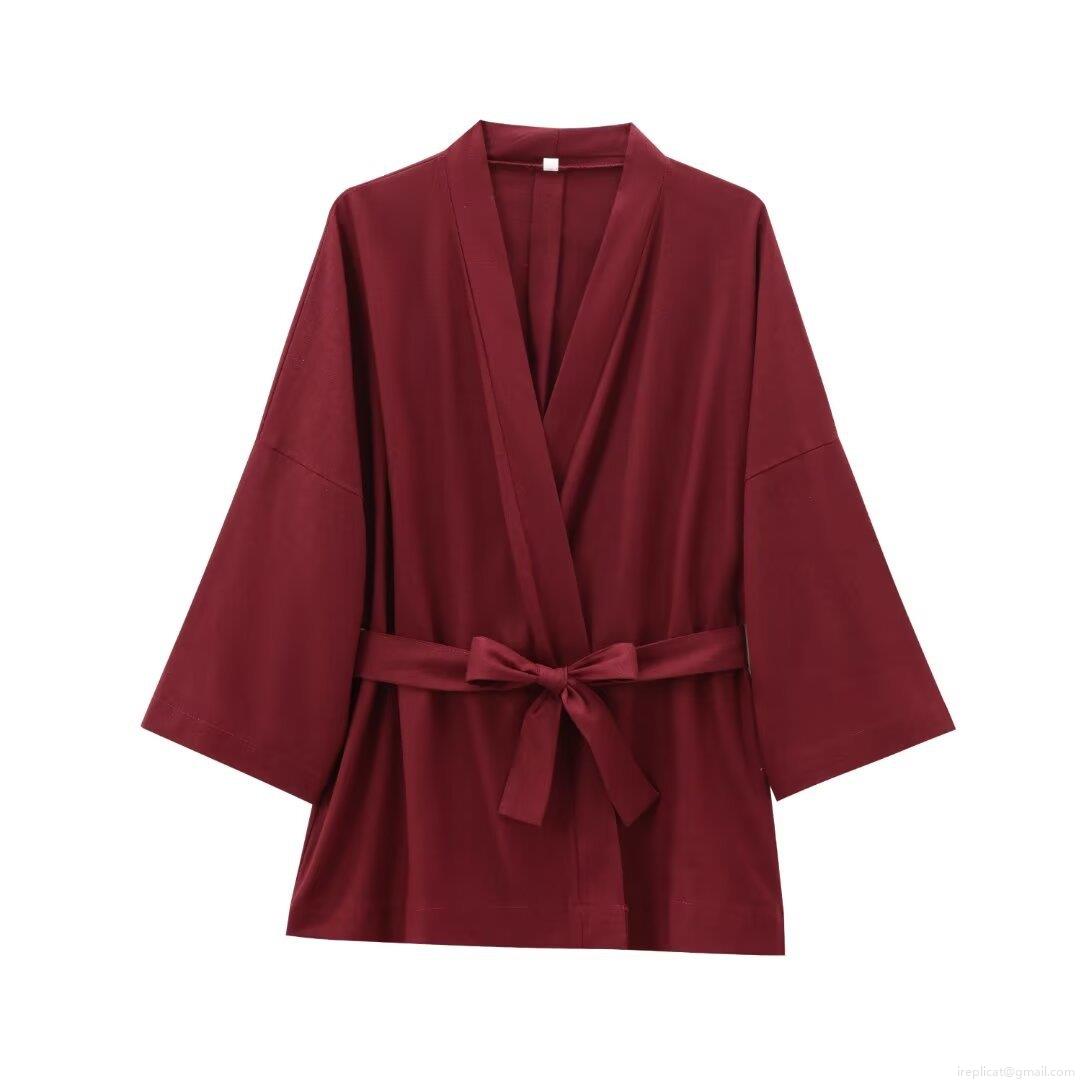 • Women Kimono Cardigan Jacket V Neck Solid Color Belted Tie Waist Polyester Loose Fit Mid Length Long Sleeve Outwear For Casual Daily Streetwear