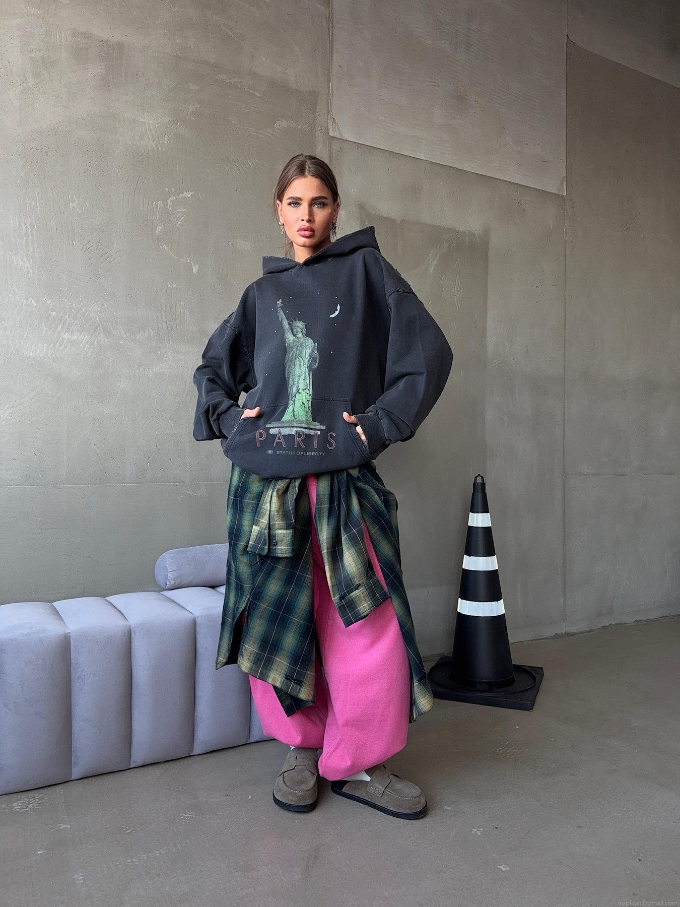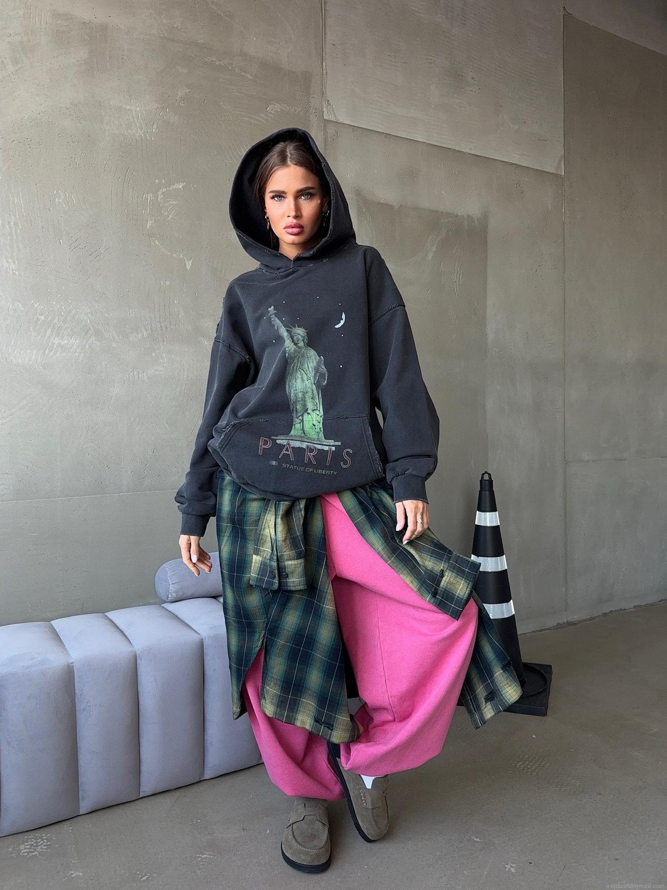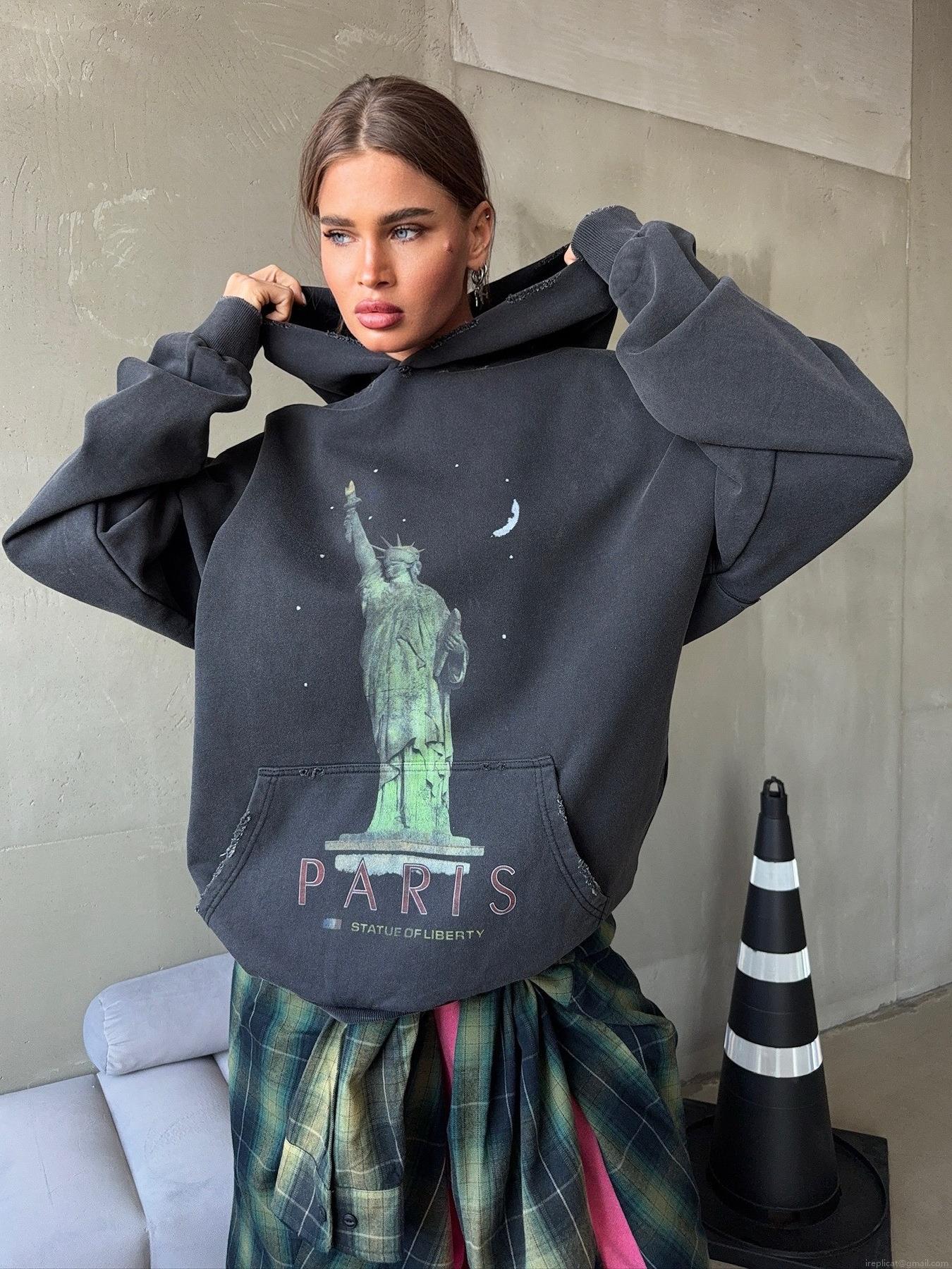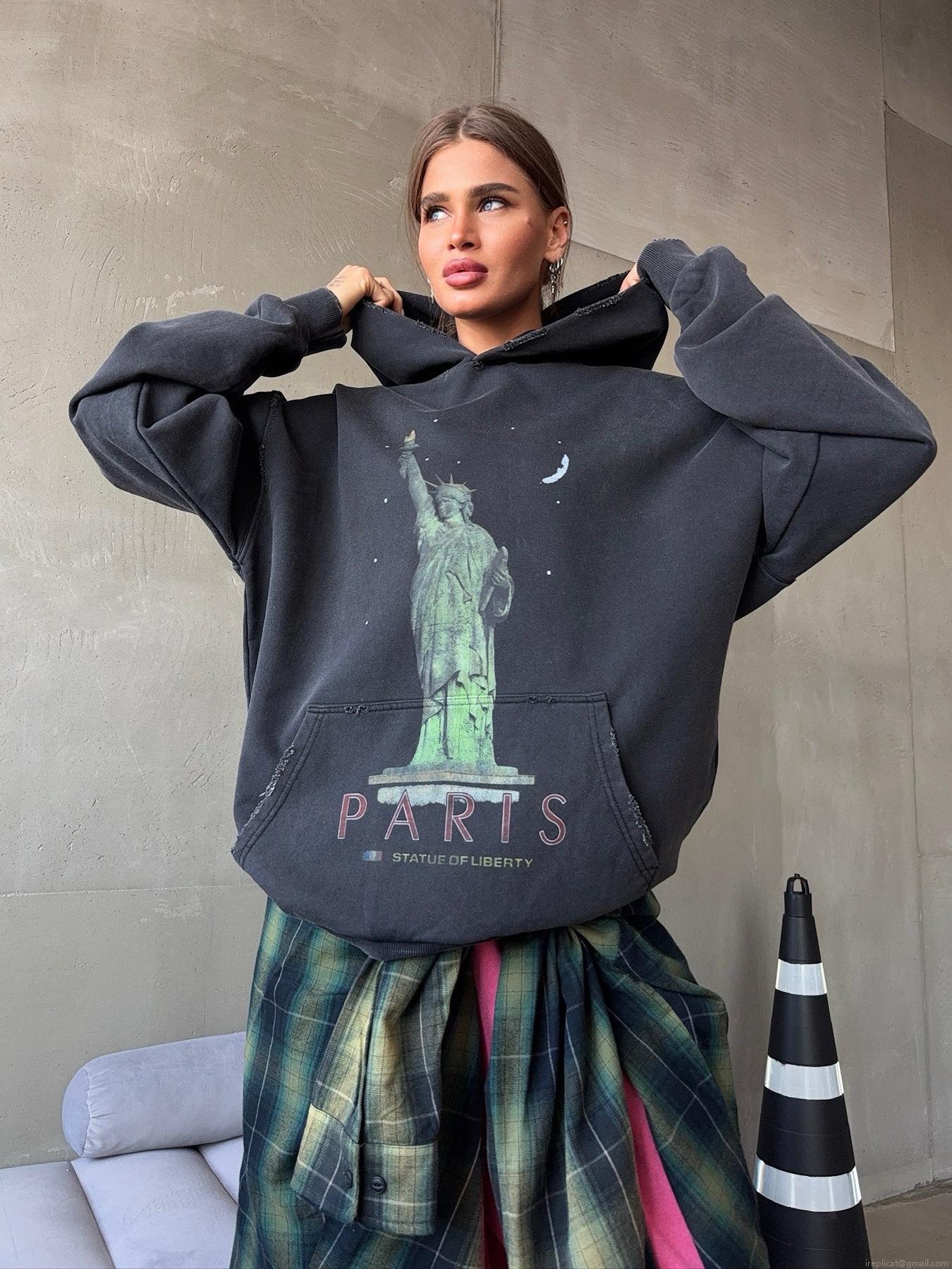 • Women Oversized Hoodie Cotton Blend American Streetwear Vintage Washed Charcoal Gray Hoodie Paris Statue Of Liberty Print Distressed Edges Pullover Sweatshirt