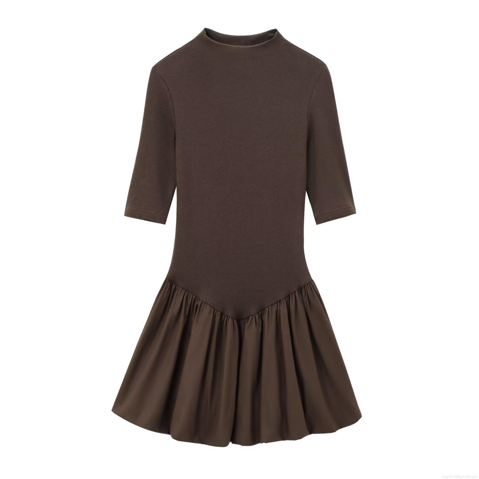 • Women Patchwork Short Sleeve Mini Dress Knit Ribbed Drop Waist Pleated Poplin Dress Round Neck Casual Fashion Streetwear Party Outfits Solid Elegant