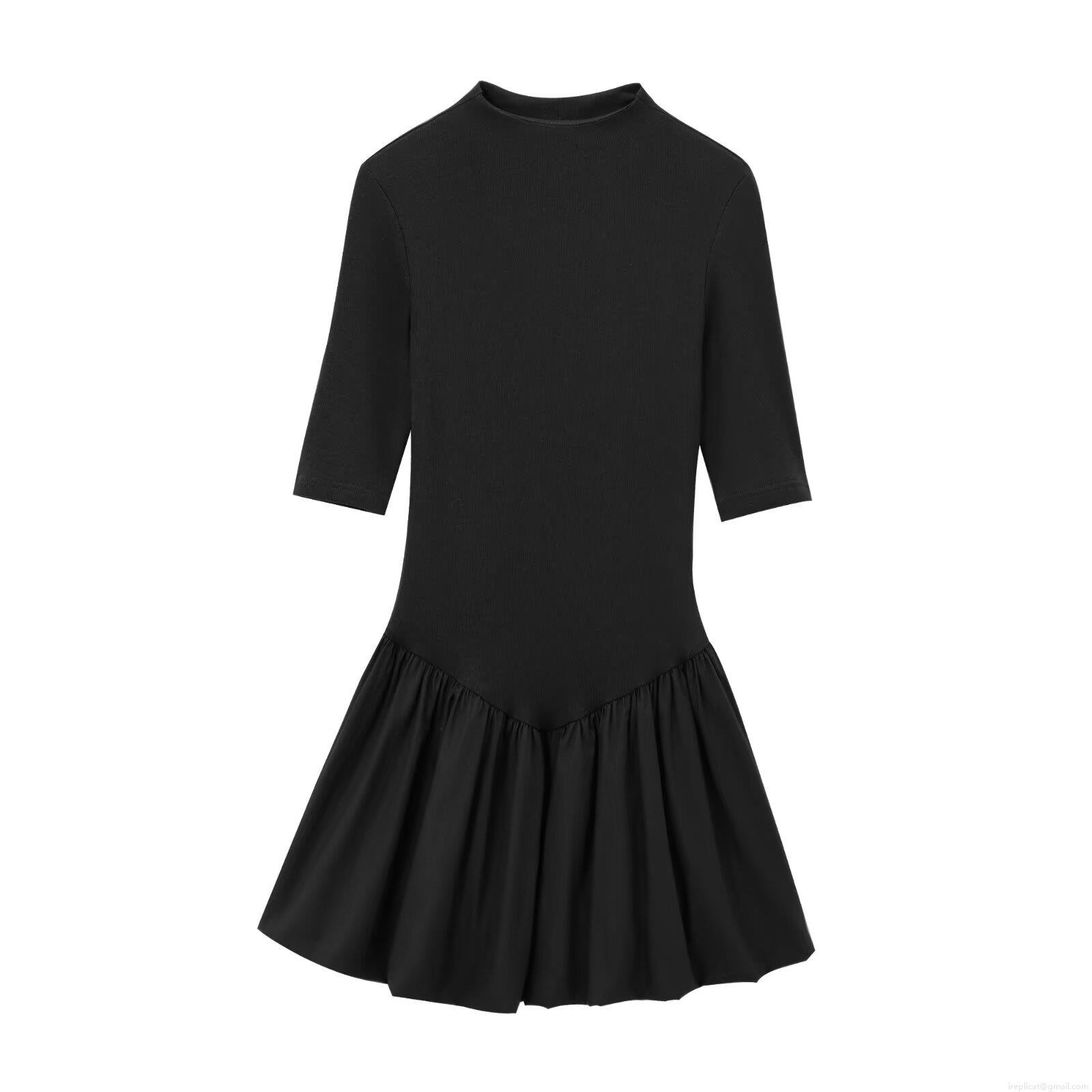 Women Patchwork Short Sleeve Mini Dress Knit Ribbed Drop Waist Pleated Poplin Dress Round Neck Casual Fashion Streetwear Party Outfits Solid Elegant