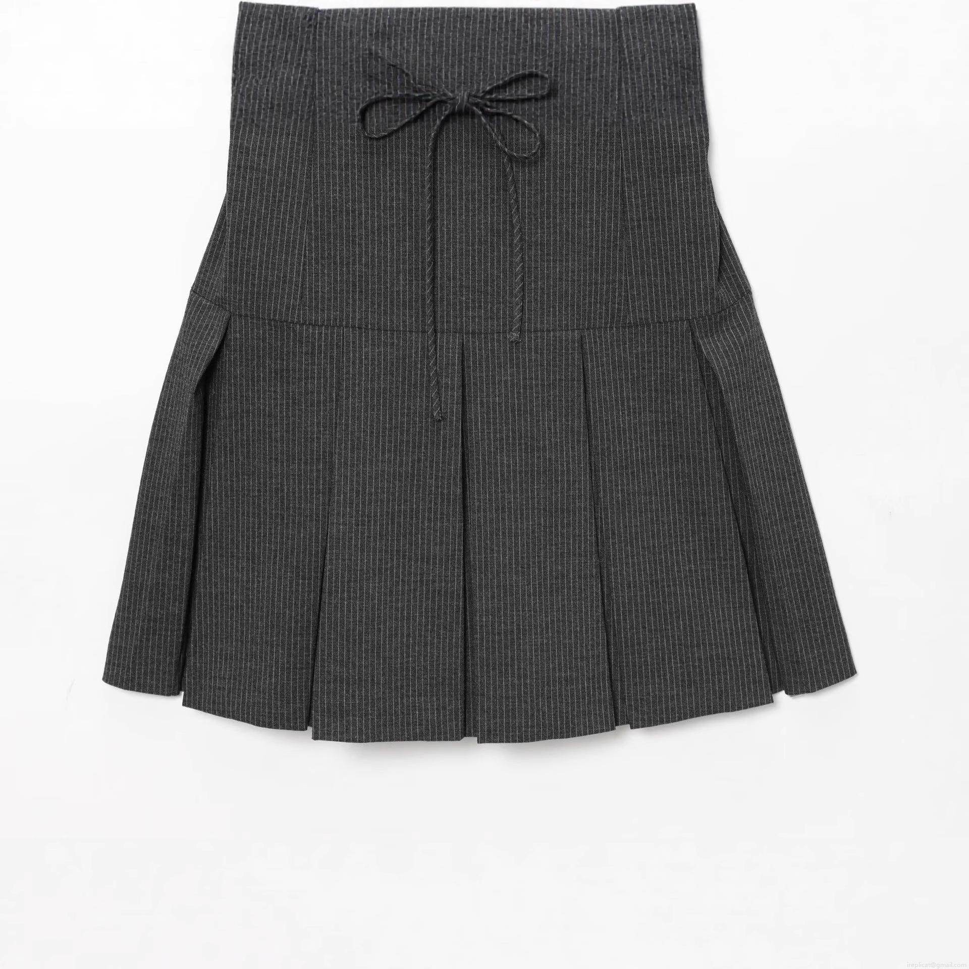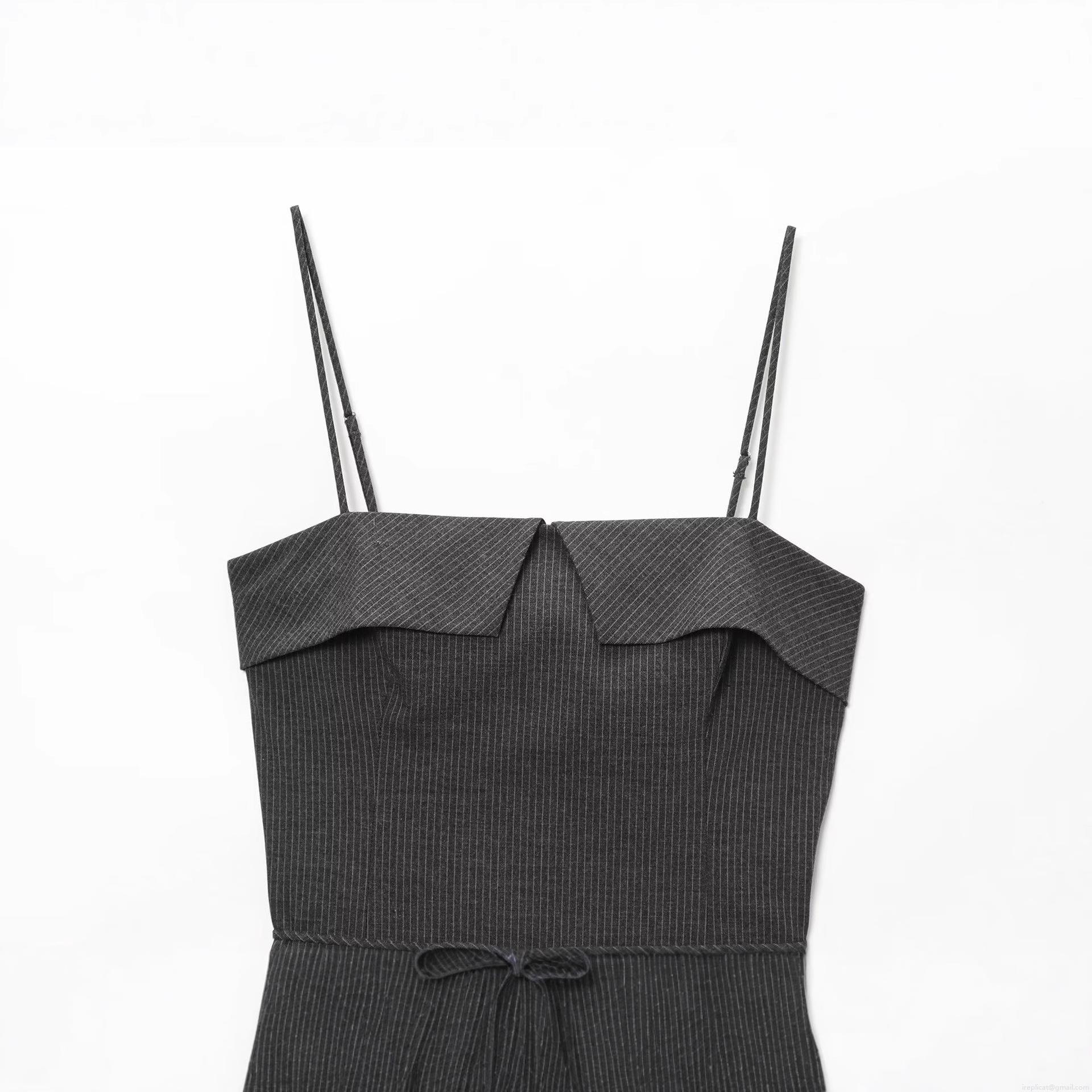 • Women Pinstripe Mini Dress Sexy Spaghetti Strap Sleeveless Pleated Dress With Waist Tie Bow Dark Grey Suit Fabric Preppy Style Bodycon Short Dress For Summer Daily Party