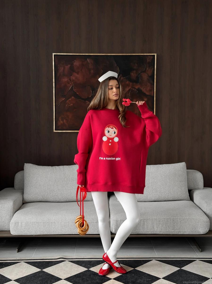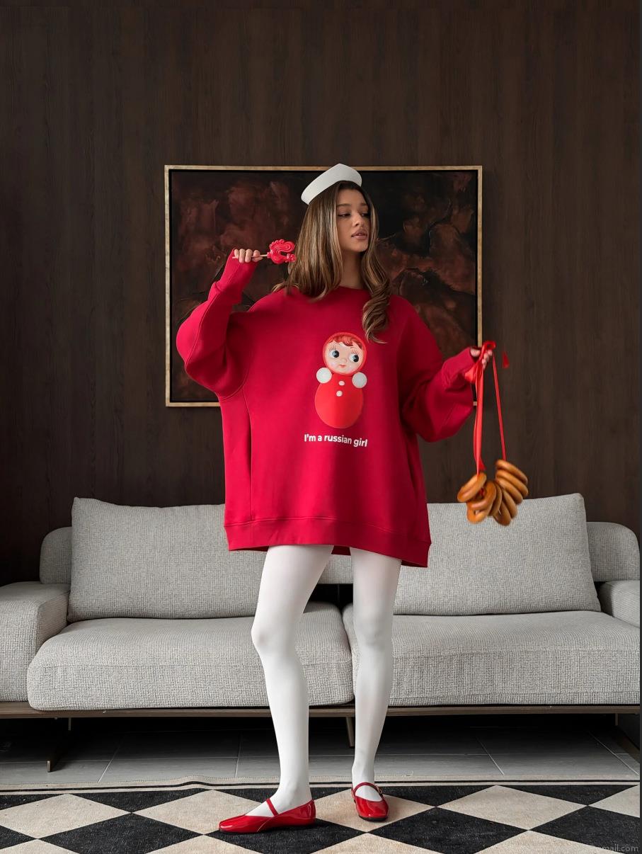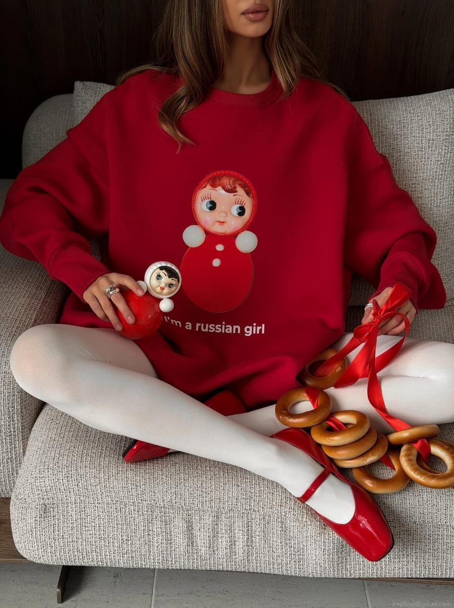 Women Round Neck Loose Cotton Sweatshirt Long Sleeve Russian Doll Print Contrast Color Streetwear Casual Pullover Top