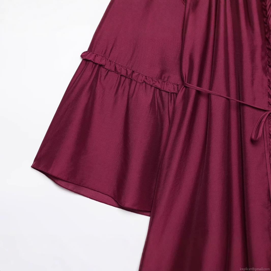 • Women Satin Polyester Ruffle Mini Dress Flare Sleeve Round Neck Pleated Shirt Dress Drawstring Waist Party Dating Streetwear Burgundy