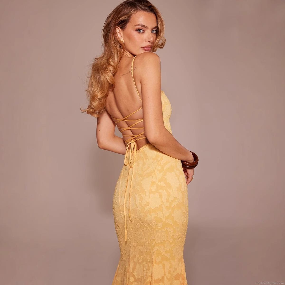 • Women Sexy Backless Jacquard Maxi Dress Sleeveless Lace Up Fishtail Party Evening Dress French Elegant Bodycon Long Sun Dress For Wedding Date Summer