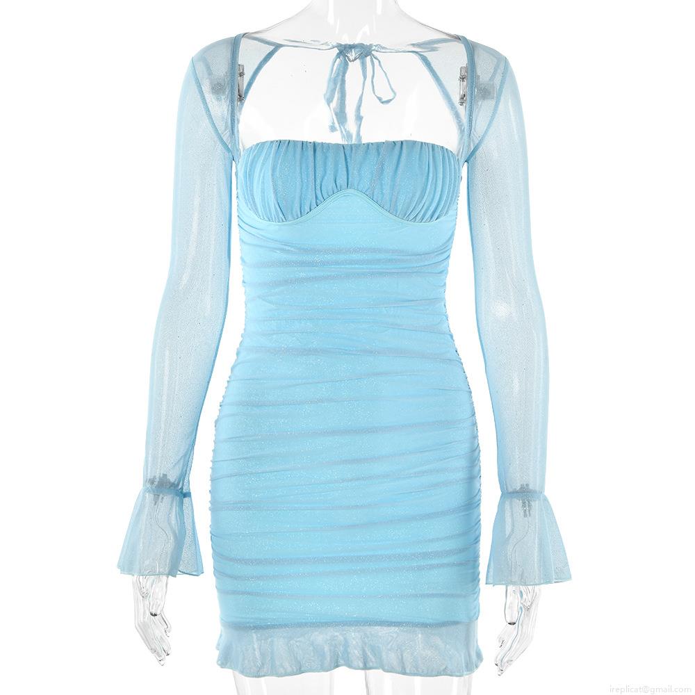 Solid Color, Pleats, Ruffles, Glitter, Backless, Transparent Mesh, Bell Sleeves