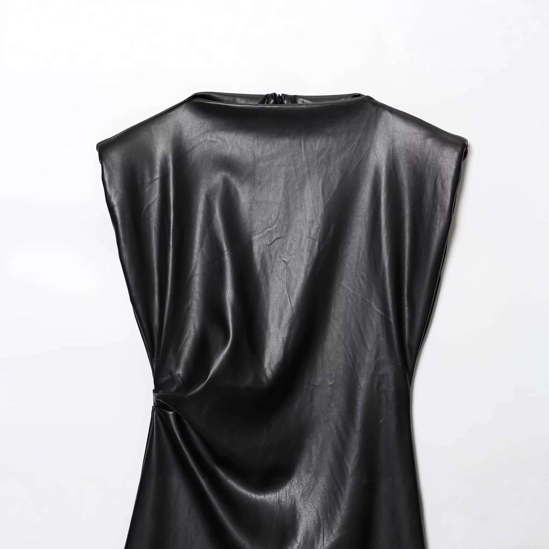 • Women Sexy Black PU Faux Leather Sleeveless Mini Dress Elegant Ruched Bodycon Party Dress Round Neck Evening Short Dress For Clubwear Lady