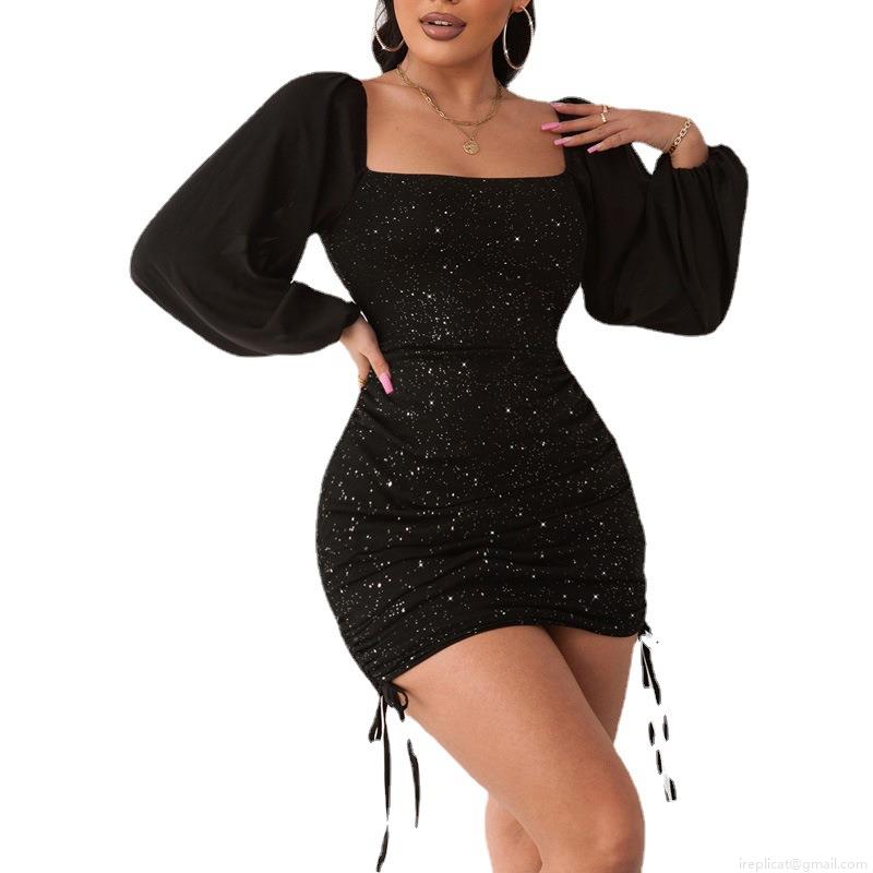 • Women Sexy Bodycon Mini Dress Ruched Drawstring Square Neck Long Lantern Sleeve Shimmer Sequin Party Night Out Dresses