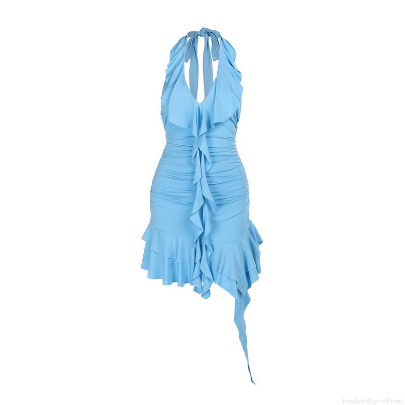 • Women Sexy Bodycon Mini Dress Ruched Halter V-Neck Ruffle Hem Sleeveless Knitted Party Dress Polyester Spandex Summer Slim Fit Streetwear Night Clubwear