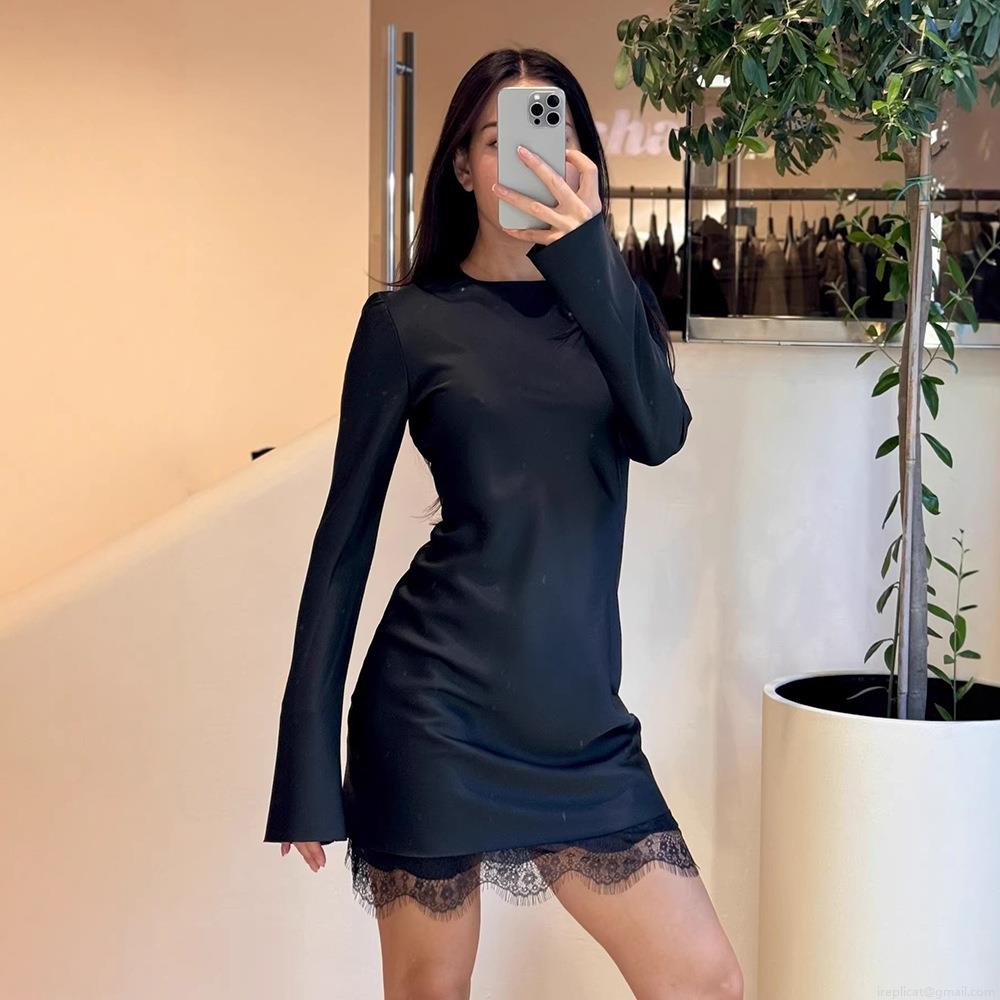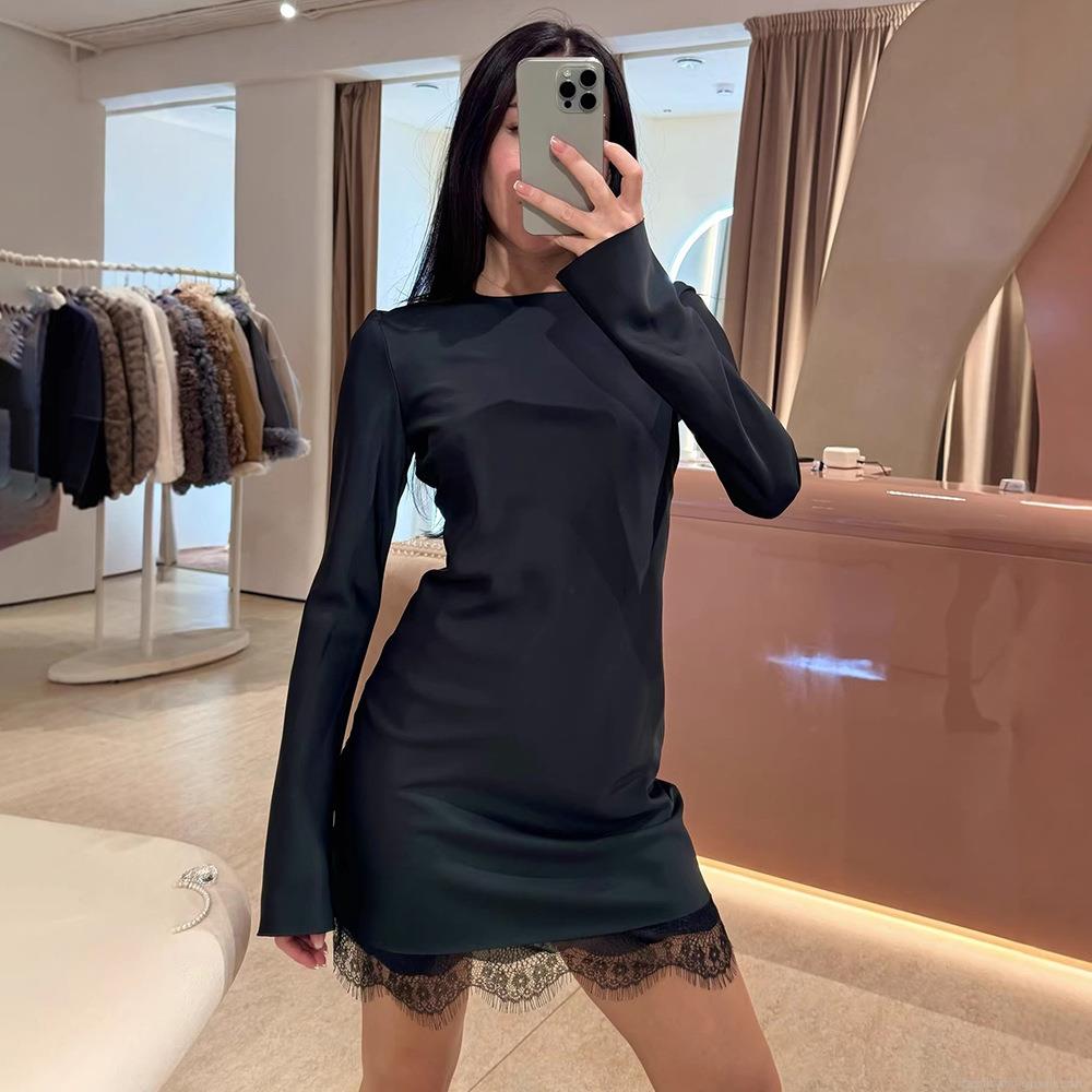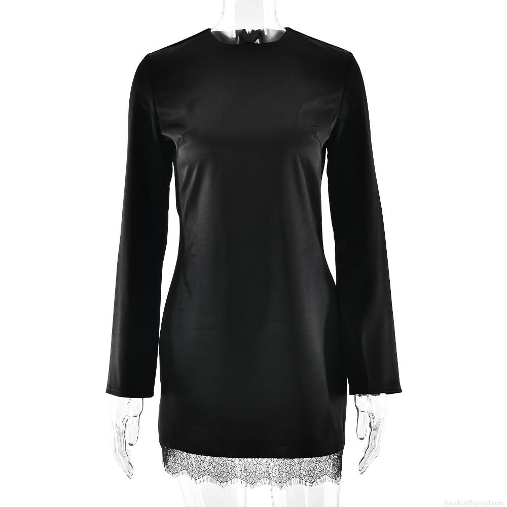 • Women Sexy Bodycon Mini Dress Sateen Patchwork Lace Hem Long Sleeve Round Neck Back Invisible Zipper Slim Fit Short Dress For Party Banquet Club Cocktail Night Out