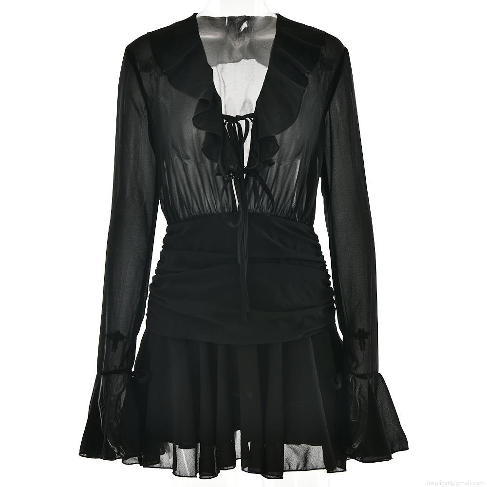 • Women Sexy Deep V-Neck Chiffon Mini Dress Long Sleeve Ruffle Trim Drawstring Waist Patchwork Party Dress Elegant Solid Color Clubwear Short Skirt for Ladies